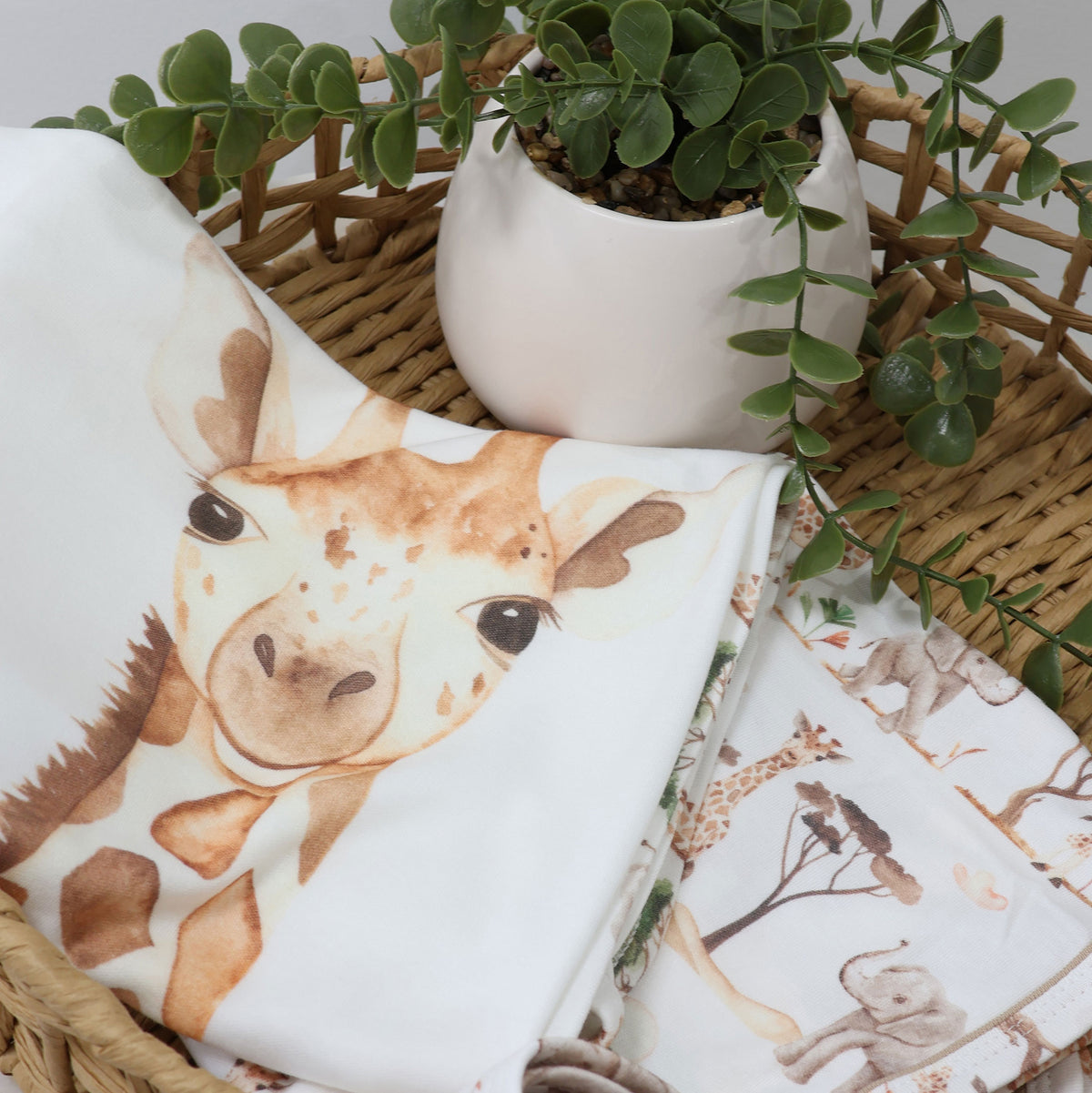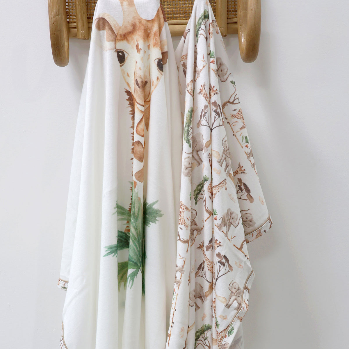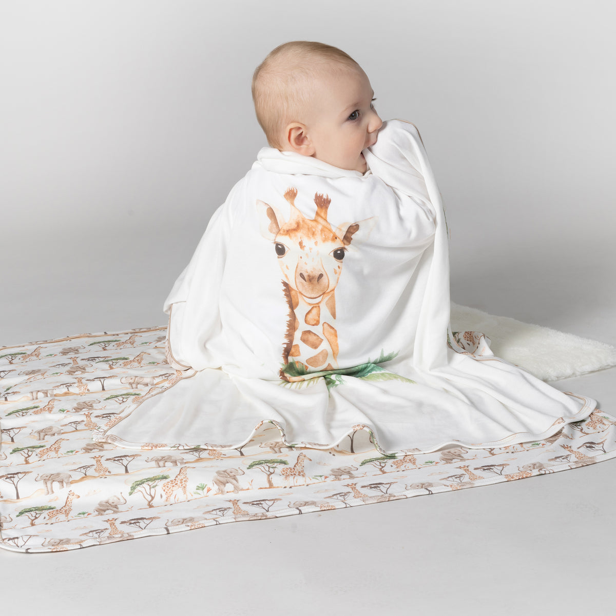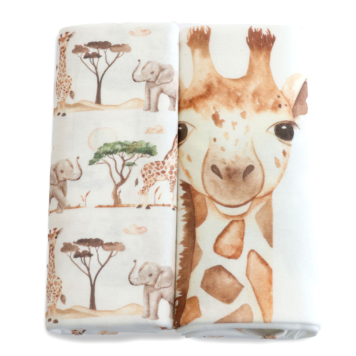 Each piece in our collection is designed to inspire curiosity and creativity, featuring a giraffe character surrounded by lush greens to promote a soothing atmosphere.            These gorgeous jersey wraps are made from soft  jersey for comfort and have just the right amount of stretch to keep your little one cosy and well wrapped.