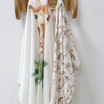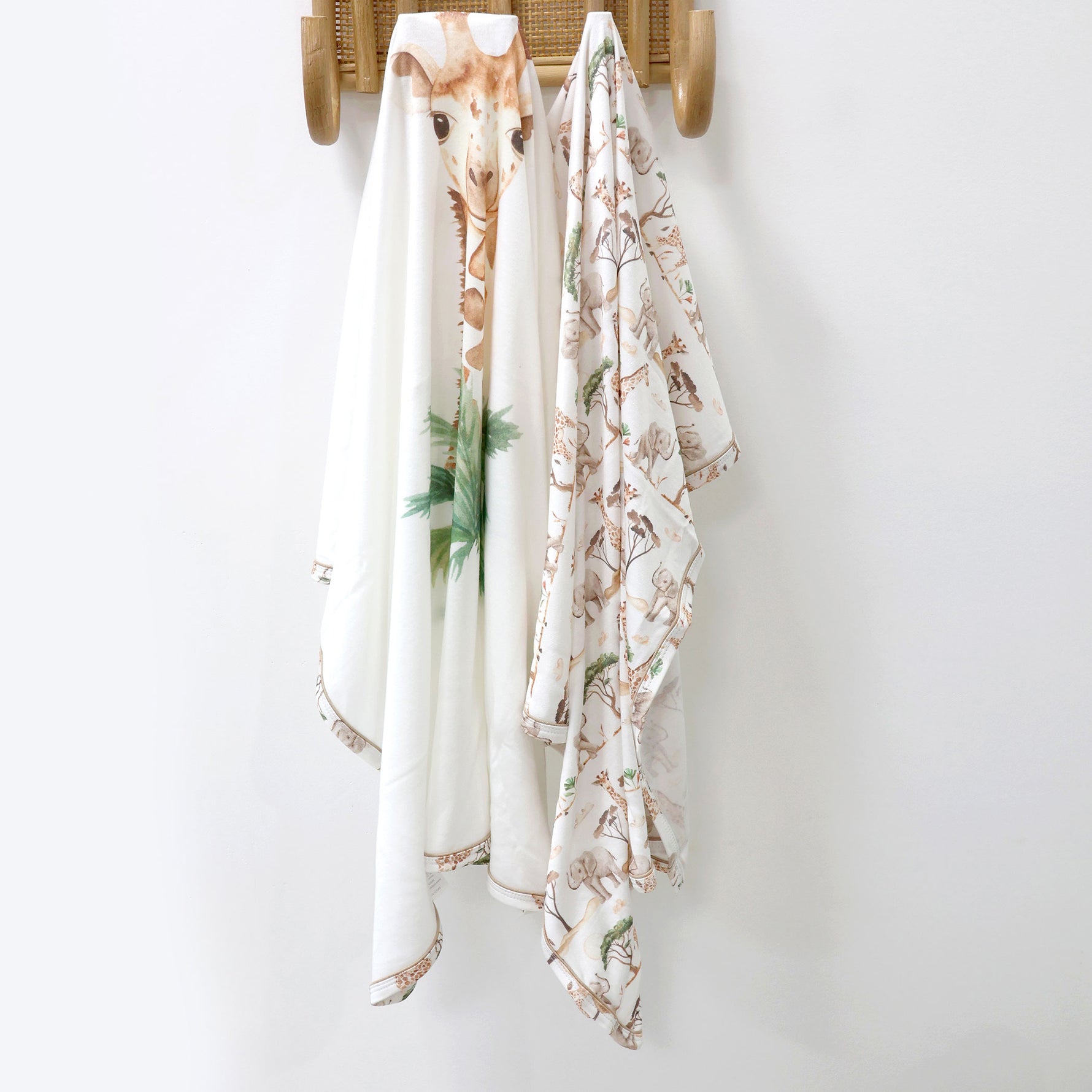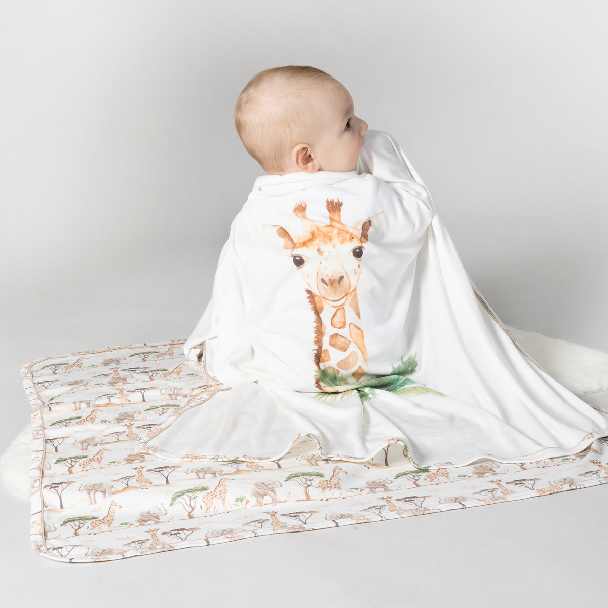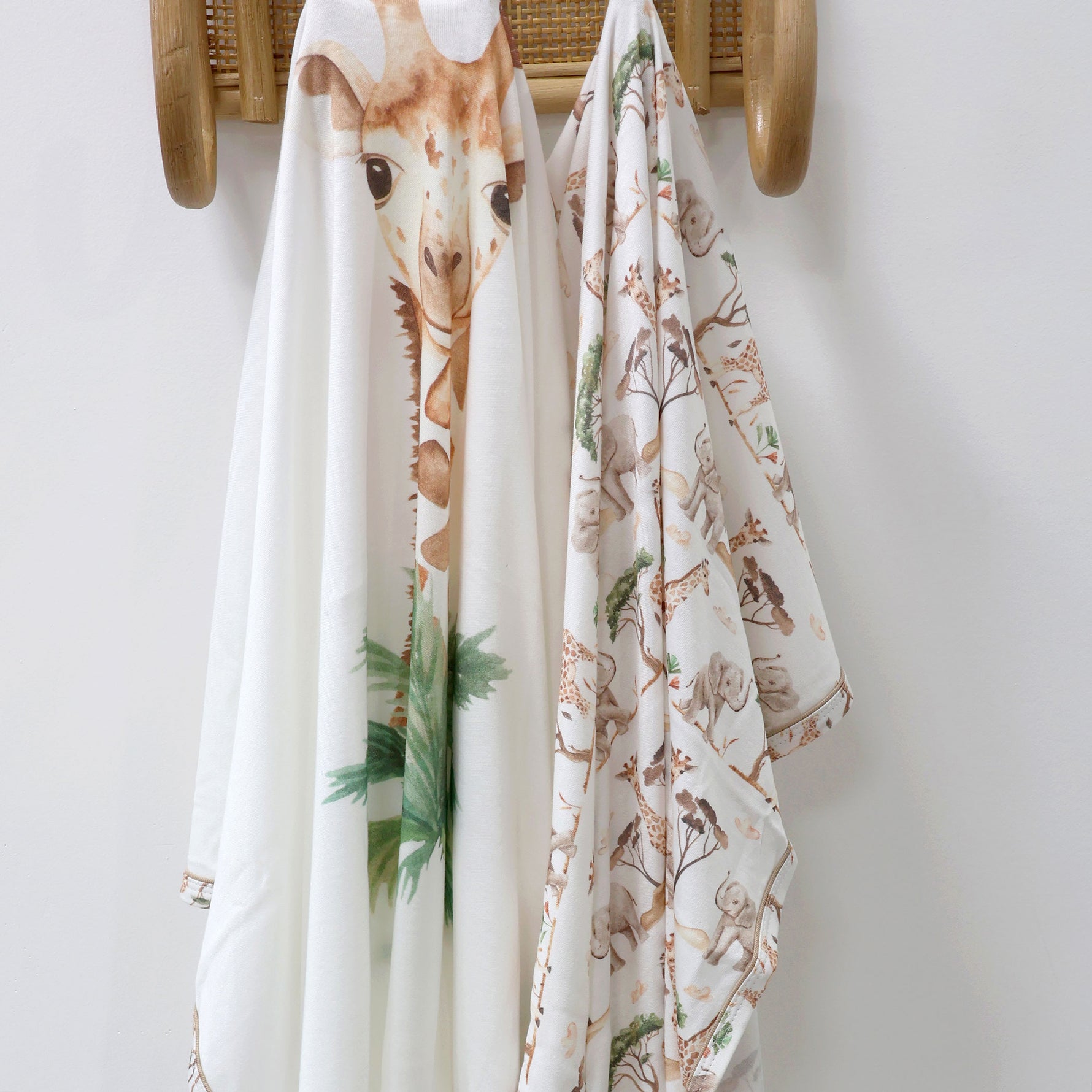 Each piece in our collection is designed to inspire curiosity and creativity, featuring a giraffe character surrounded by lush greens to promote a soothing atmosphere.            These gorgeous jersey wraps are made from soft  jersey for comfort and have just the right amount of stretch to keep your little one cosy and well wrapped.