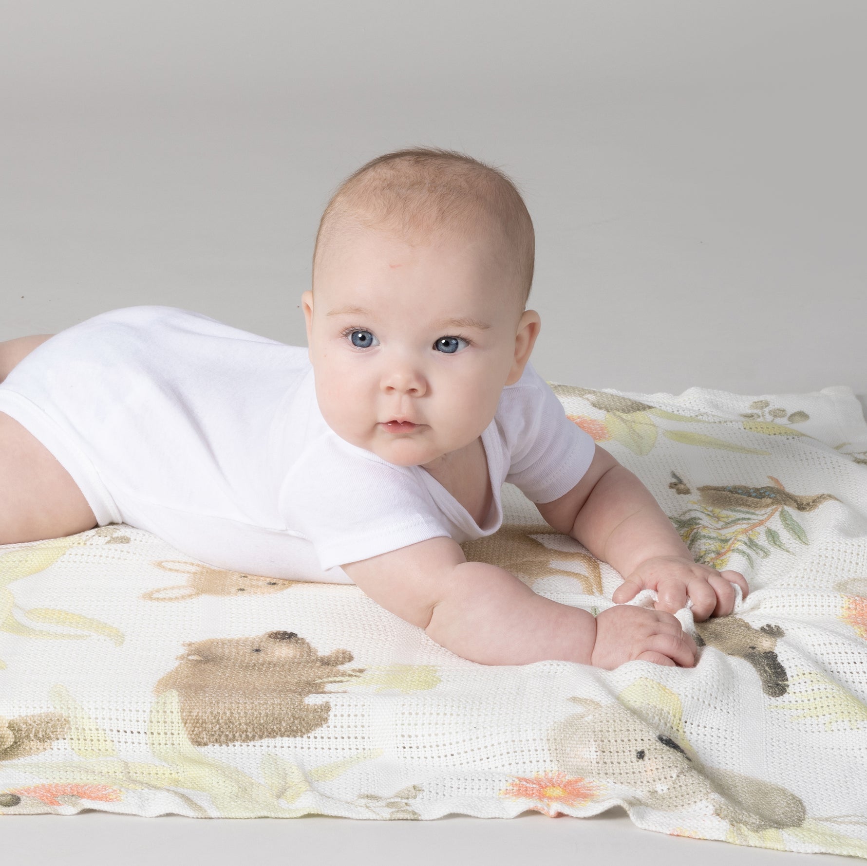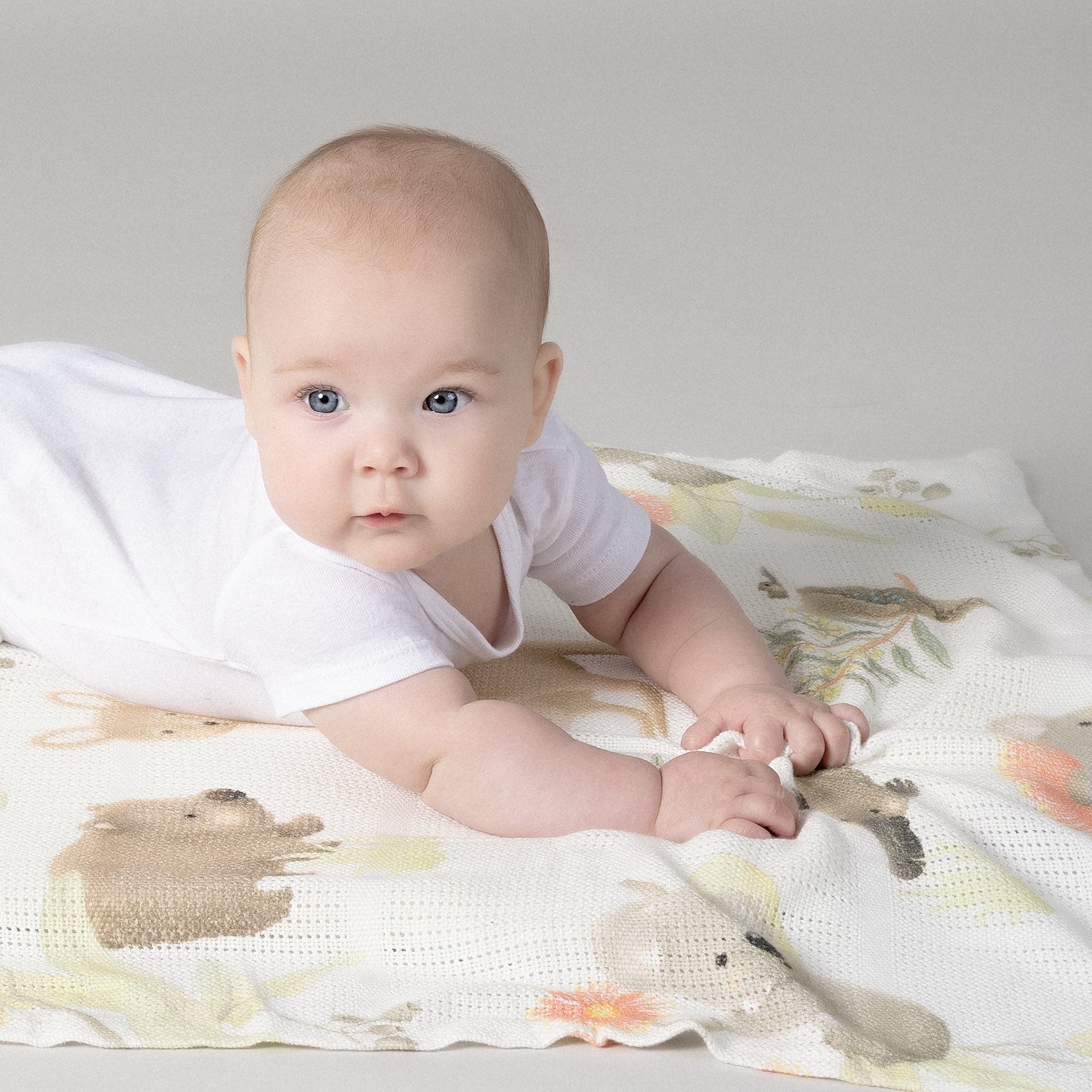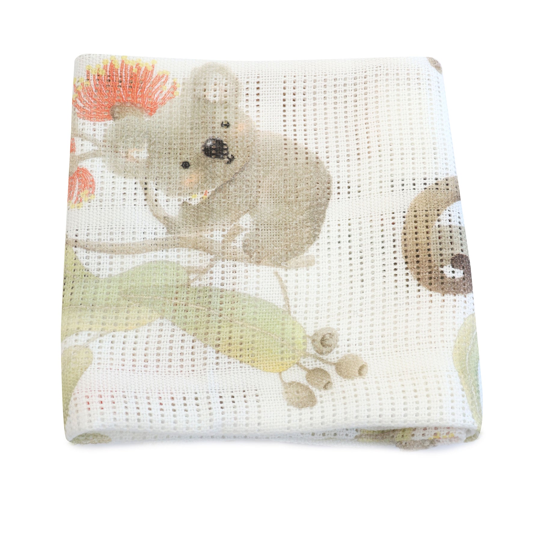 This gorgeous soft & comfortable, airflow, classic cellular blanket designed by Bubba Blue is the perfect blanket for all year round. It features a sweet all over print with many of your favourite Australian bush animals.