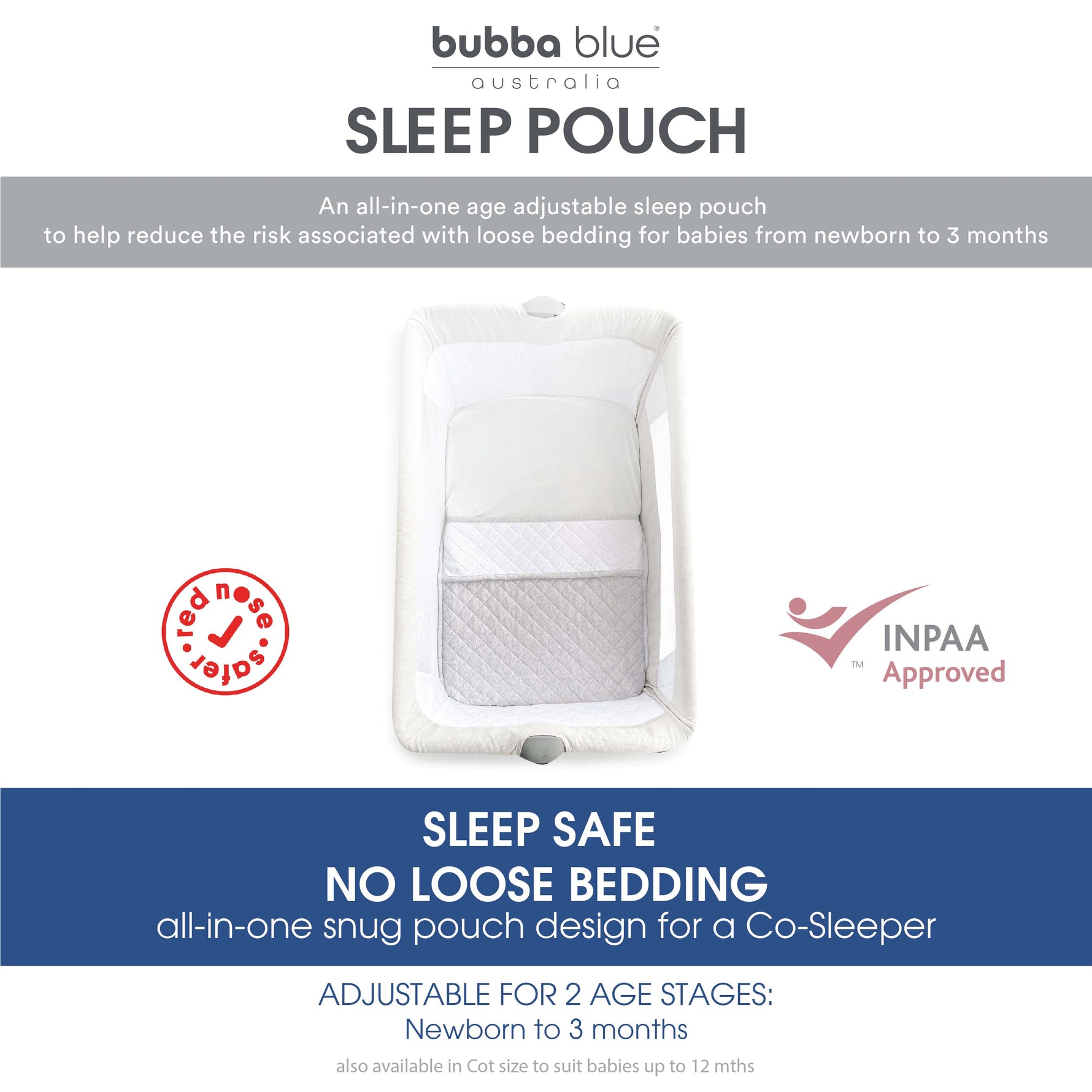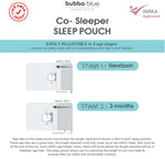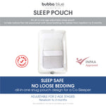 Sleep baby safely with the patented Bubba Blue® Sleep Pouch. An all-in-one sleep pouch design to help reduce the risk associated with loose bedding for babies in a co-sleeper.