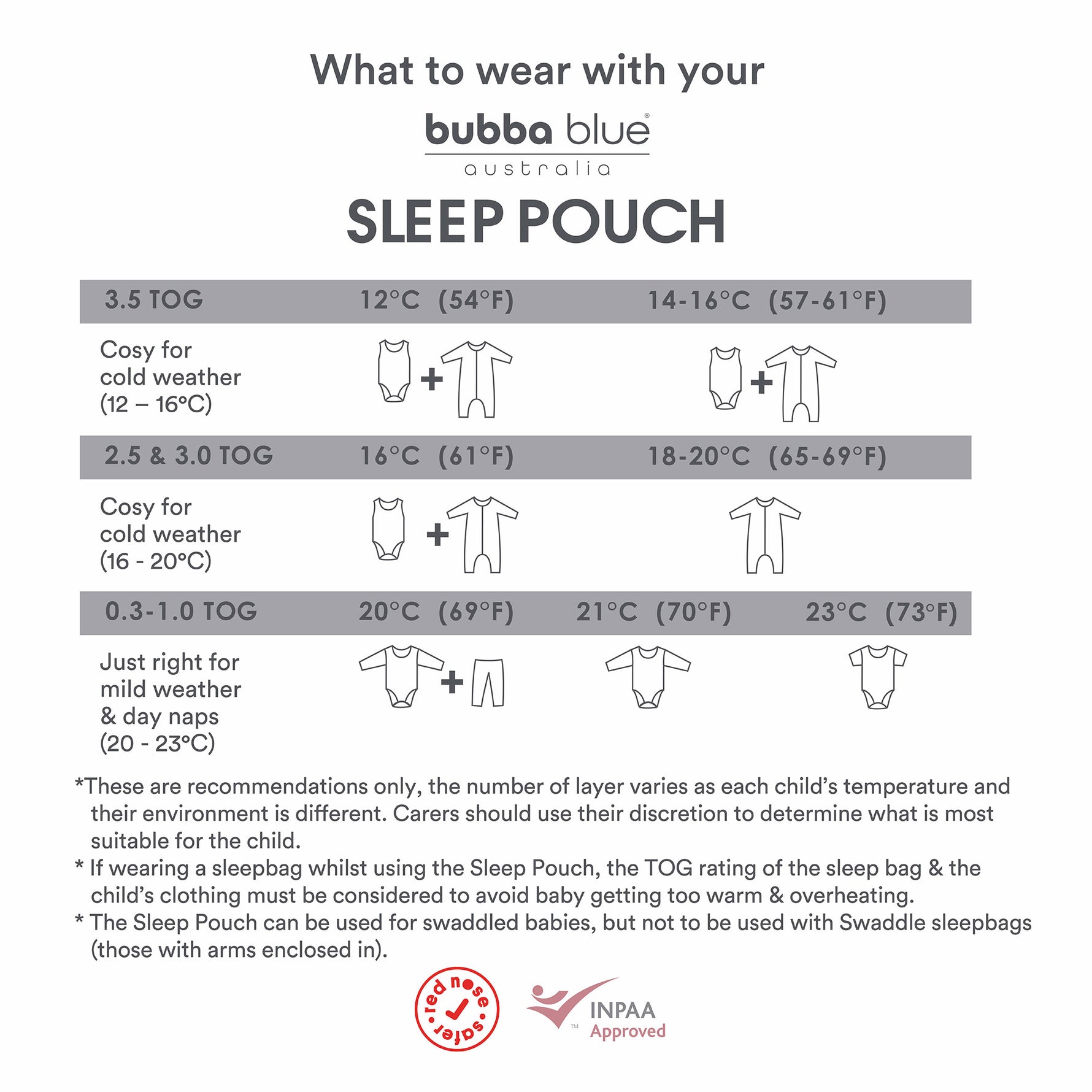 A useful guide is to dress baby as you would dress yourself: to be comfortable, neither too hot nor too cold. If wearing a sleepbag, dress with lighter layers underneath. The number of layers varies as each child’s body temperature & environment is different. Carers should use their discretion to determine what is most suitable for the child.