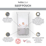 • The Bubba Blue Sleep Pouch® features the AIR™+ Air Flow Panel, on the top edge of the Sleep Pouch that lies across baby's chest. Made from organic cotton mesh & 3D spacer mesh for optimal air circulation for safety and comfort.