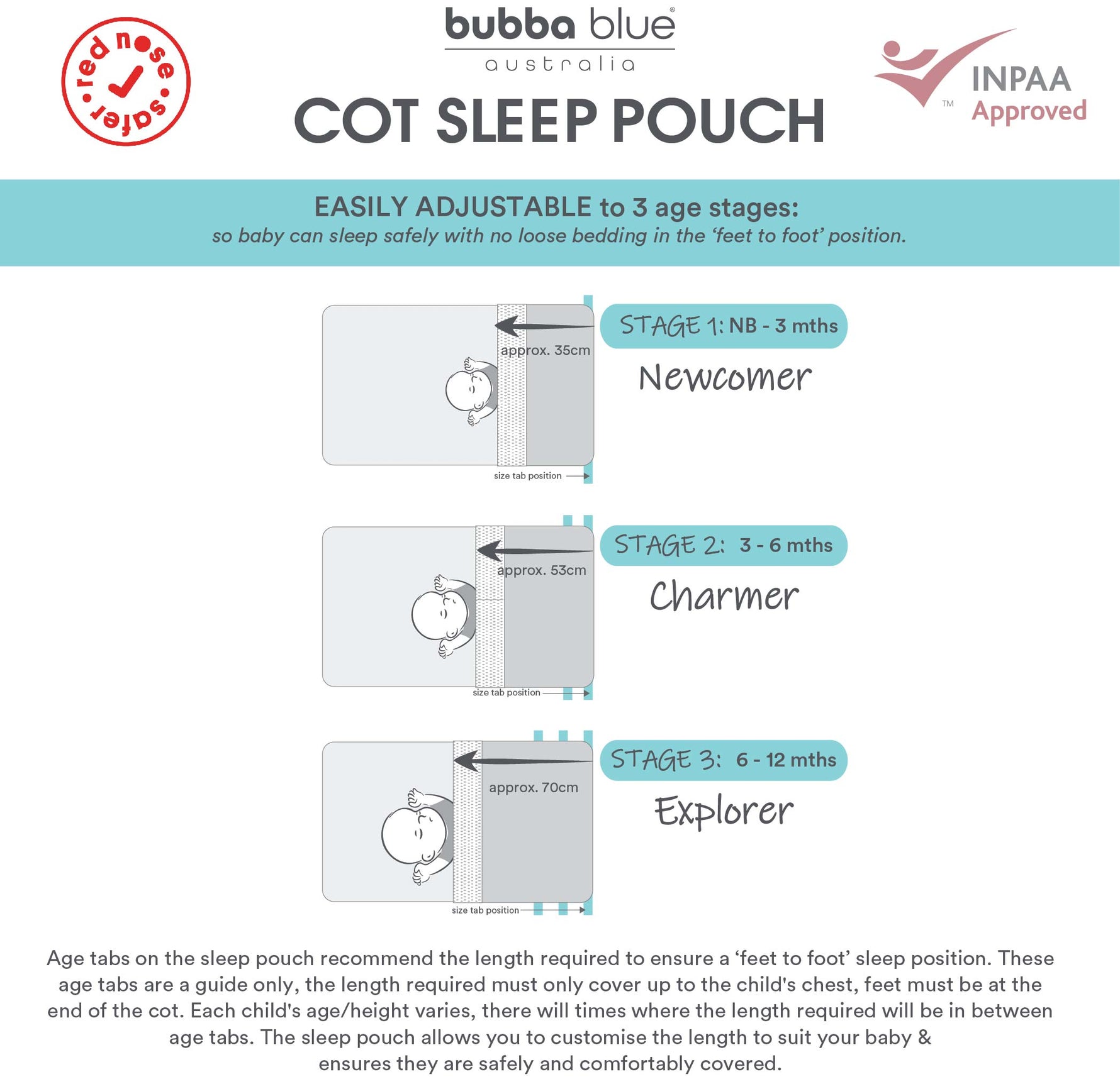 • Promotes the safe sleep position of 'feet to foot': Safe sleeping guidelines recommend baby sleep with their feet at the foot of the cot with the top edge of the pouch no higher than the baby’s chest. With Bubba Blue's Sleep Pouch, it fits at the end of the mattress. Know they're safely positioned & covered without any loose bedding.