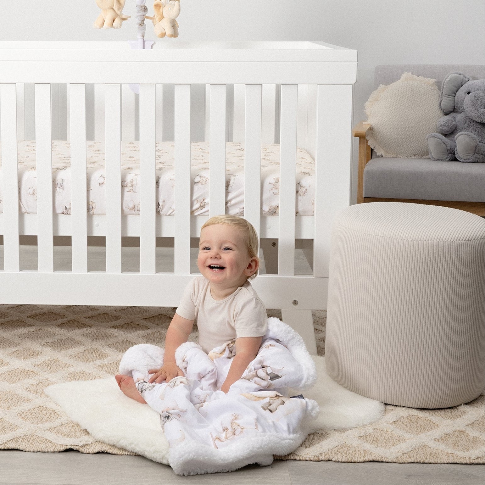 Stars twinkle above, like lullabies stitched in silver. The herd sleeps, wrapped in night’s soft embrace. Think softest clouds, twinkling motifs and bedtime magic. This charming collection features soft and calming, gender neutral colour palette to suit any nursery.