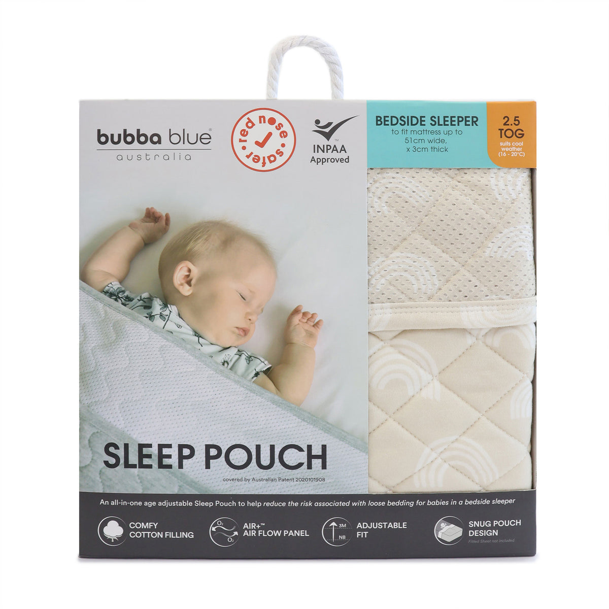 Sleep baby safely with the patented Bubba Blue® Sleep Pouch. An all-in-one sleep pouch design to help reduce the risk associated with loose bedding for babies in a bedside sleeper.
