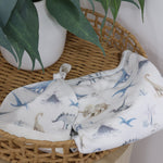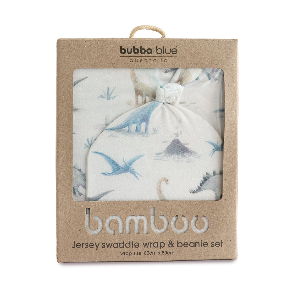 Transform your baby’s nursery into a whimsical prehistoric adventure with our enchanting Jurassic Nursery Collection. Featuring charming watercolour illustrated dinosaurs in soothing blue and earthy tones, this collection brings playful imagination to life, while ensuring a calming space for your little one to grow and enjoy. Each piece is designed to spark joy and curiosity, making bedtime a journey through a gentle world of Dino dreams. Let your child explore the magic of their imagination with our delightful and serene décor that grows with them!                                                              This gorgeous jersey wrap with matching knotted beanie are sweet and stylish for your baby. Printed jersey swaddle wrap with the newborn size beanie from the Bubba Blue Jurassic Collection are made from soft jersey for comfort and have just the right amount of stretch to keep your little one cosy and well wrapped.