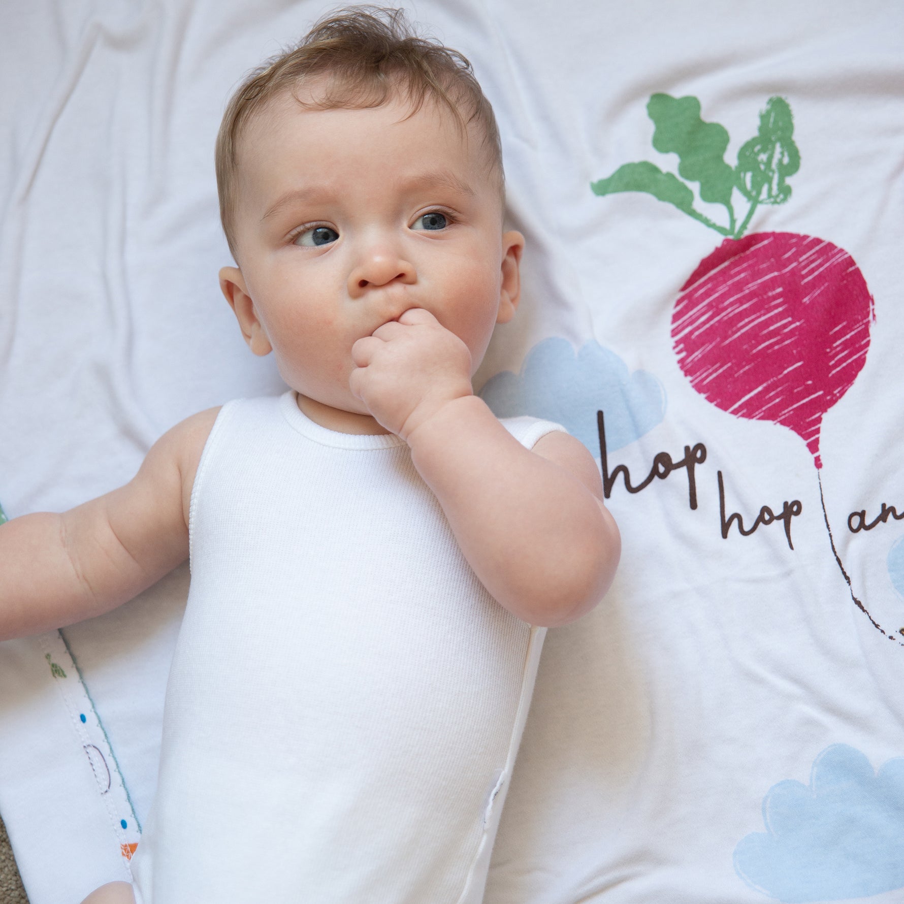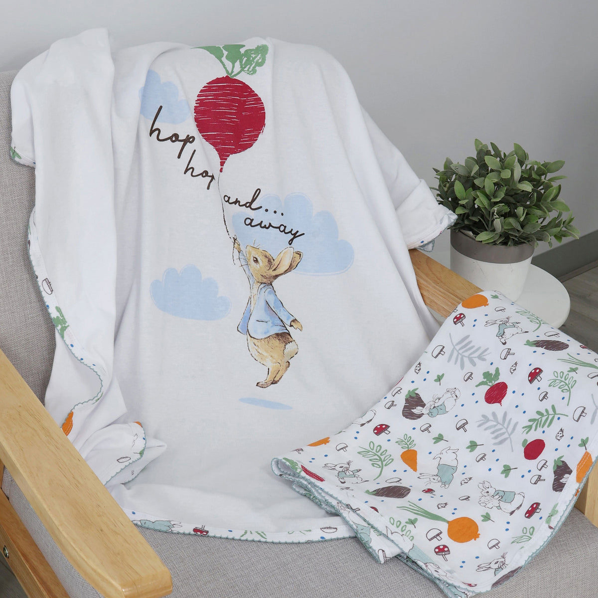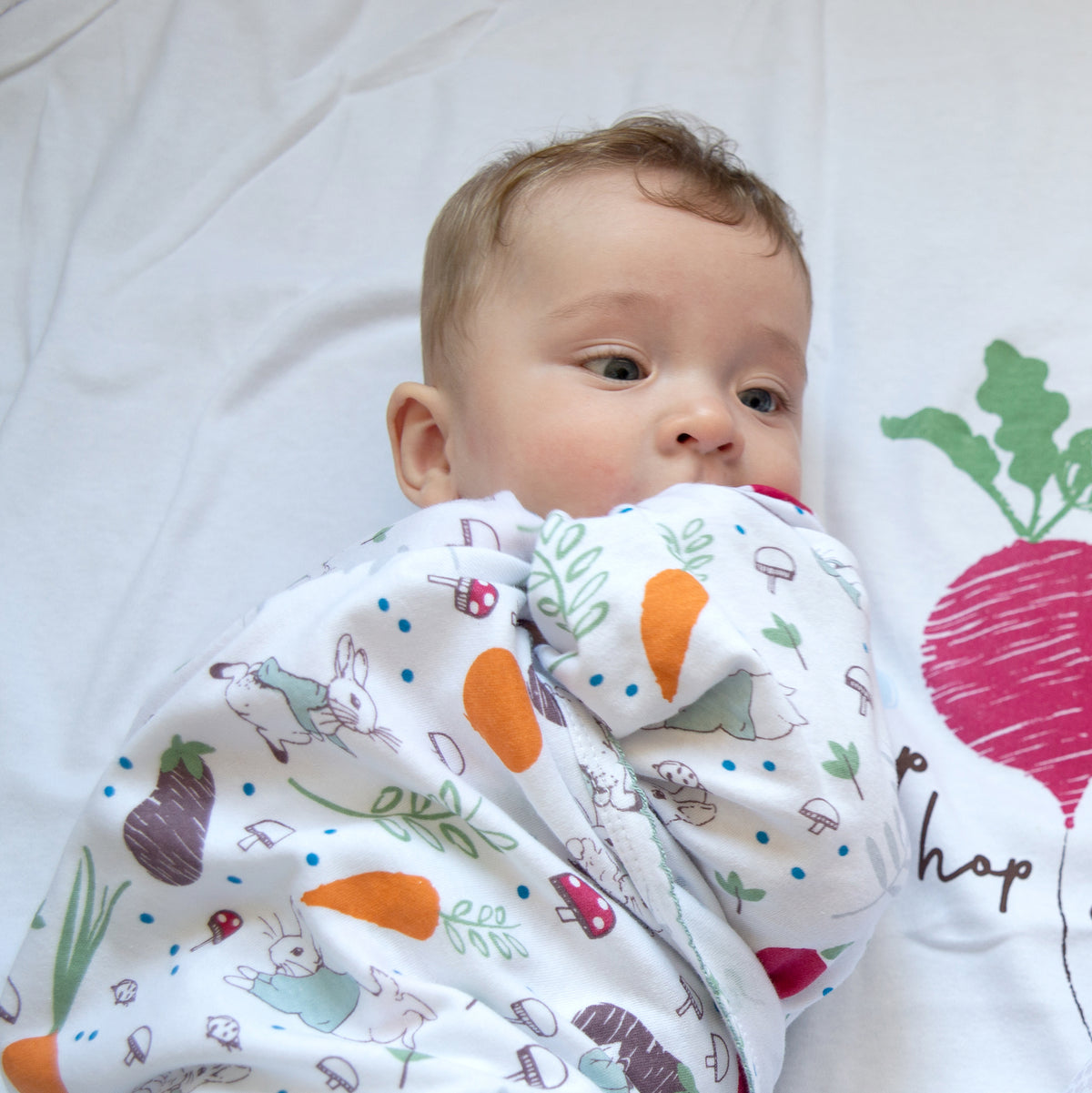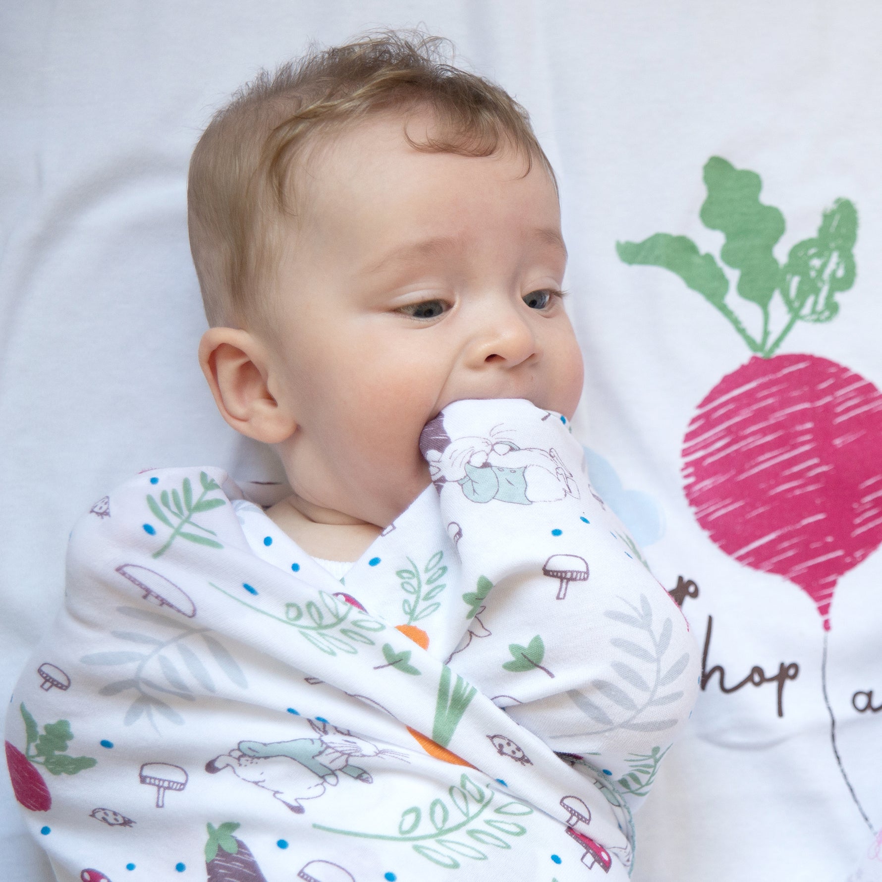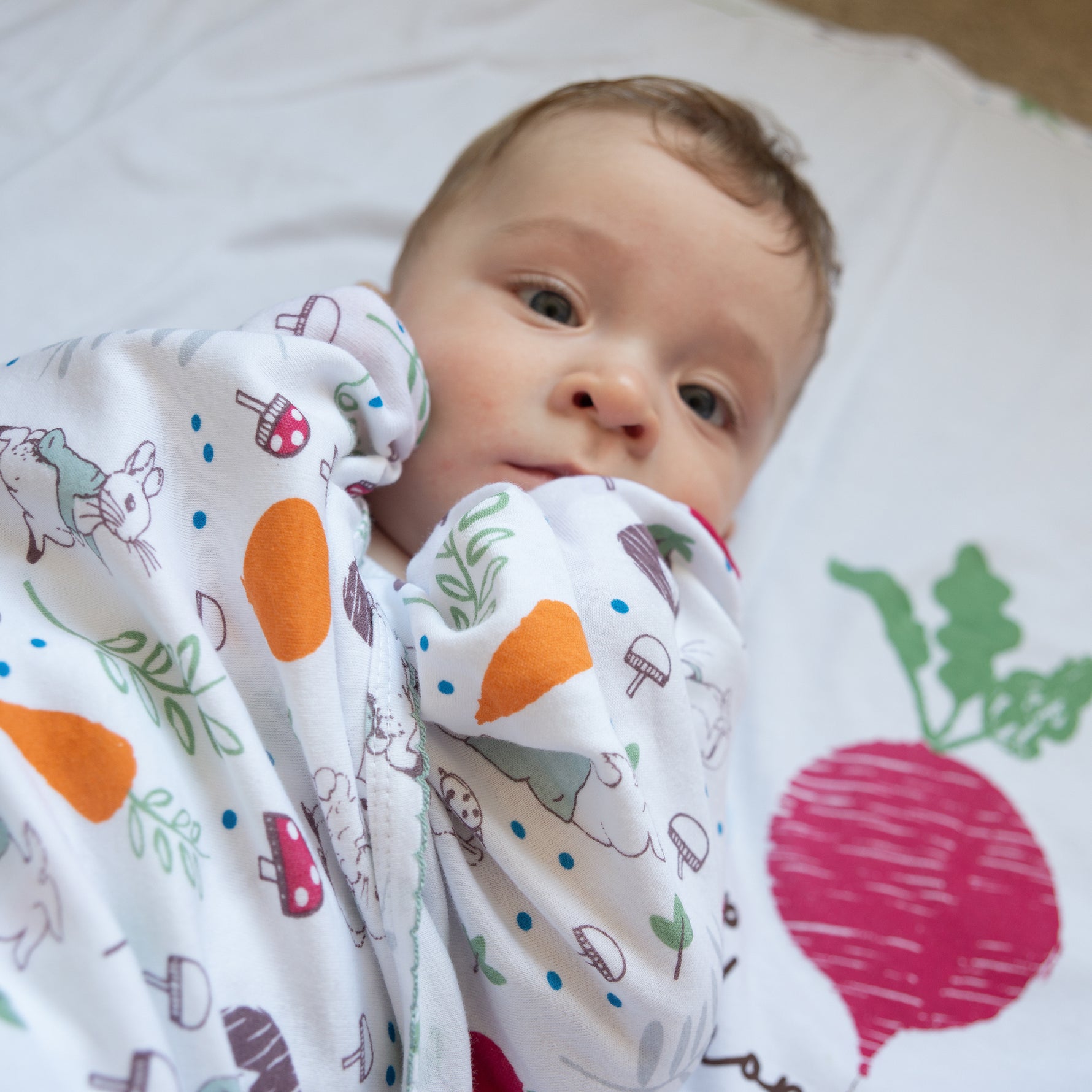 A handy pack of two printed very soft wraps is a must-have for any nursery. This design features a colourful Peter Rabbit's veggie garden printed on crisp white base.