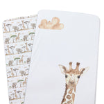 Each piece in our collection is designed to inspire curiosity and creativity, featuring a giraffe character surrounded by lush greens to promote a soothing atmosphere. These gorgeous fitted bedside sleeper sheets from the Bubba Blue Adventure Collection are made from soft jersey for comfort and feature elasticized edges for a snug fit.