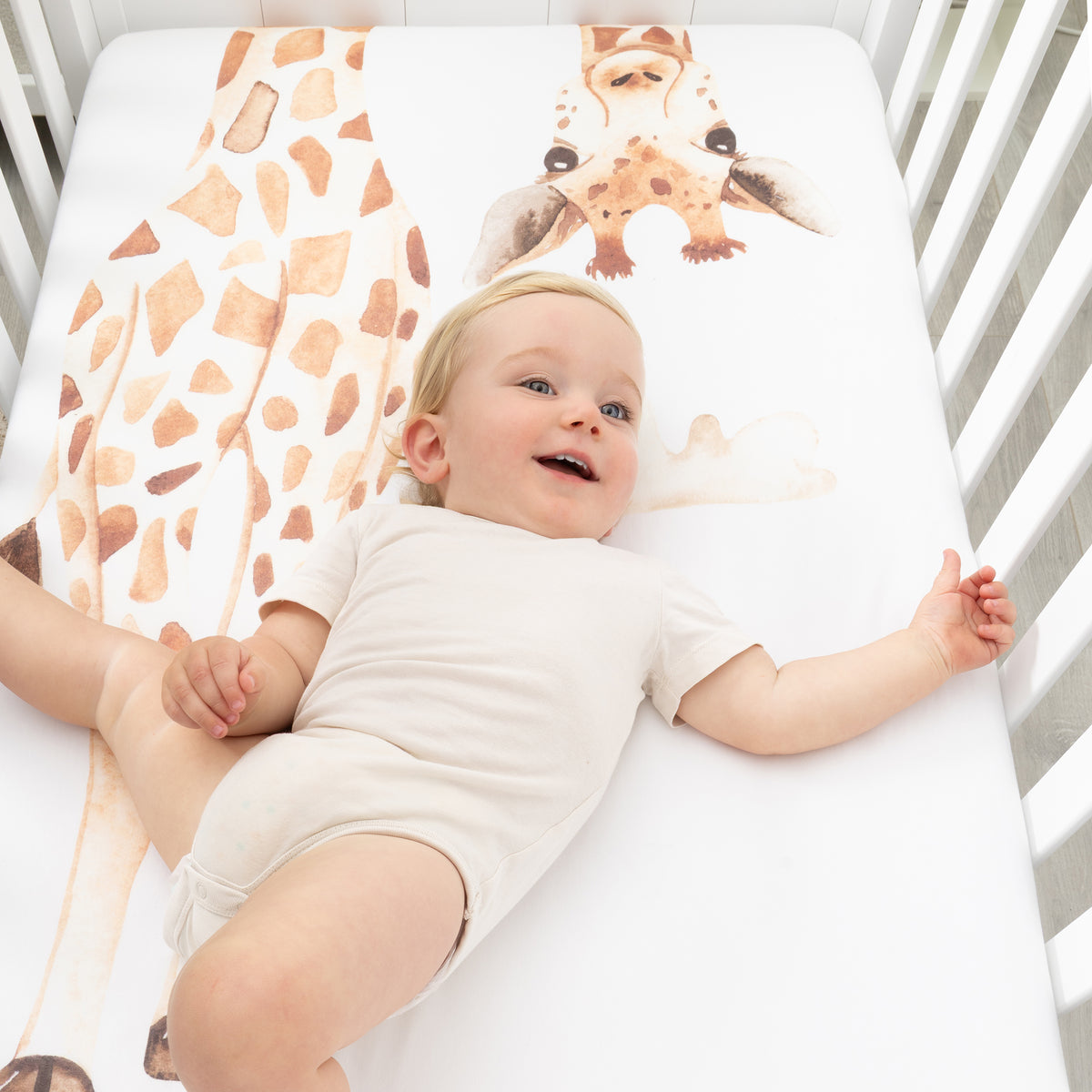 Each piece in our collection is designed to inspire curiosity and creativity, featuring a giraffe character surrounded by lush greens to promote a soothing atmosphere. These gorgeous fitted sheets designed by Bubba Blue are made from soft jersey for comfort and feature elasticized edges for a snug fit.