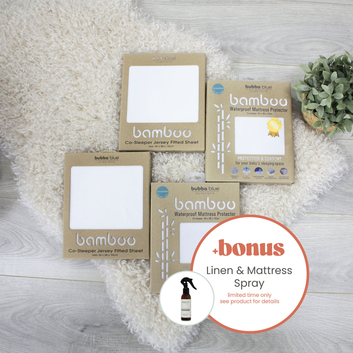 This Bundle includes 2x Bamboo White Co Sleeper/Bedside Sleeper Fitted Sheet and 2x Bamboo White Co Sleeper/Bedside Sleeper Waterproof Mattress Protector. PLUS Free Gift: 1x Linen & Mattress Spray 125ml.