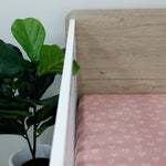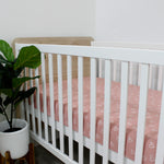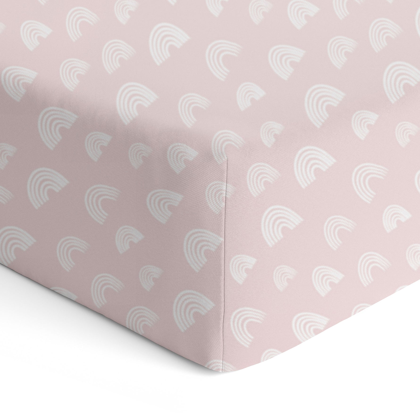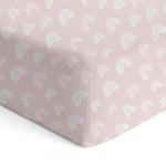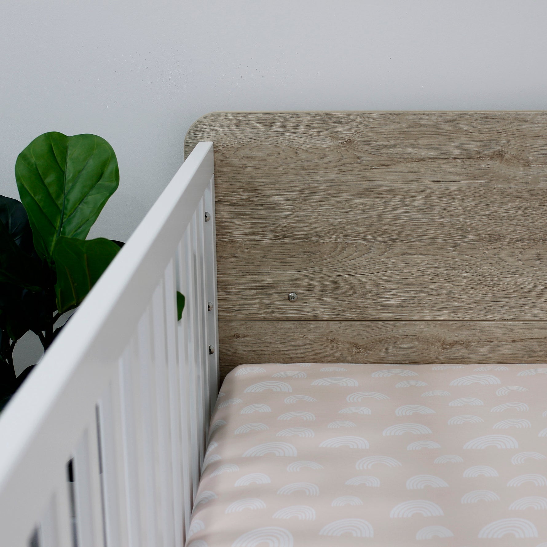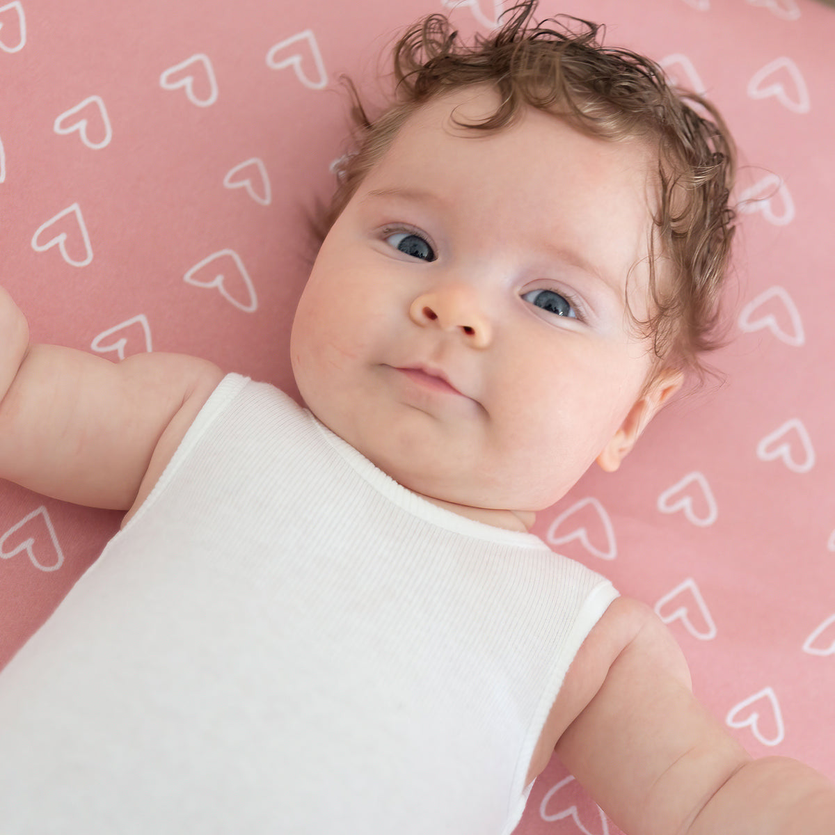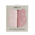 Pack includes one dusty rose rainbow design and one dusty berry heart design cot fitted sheet.
