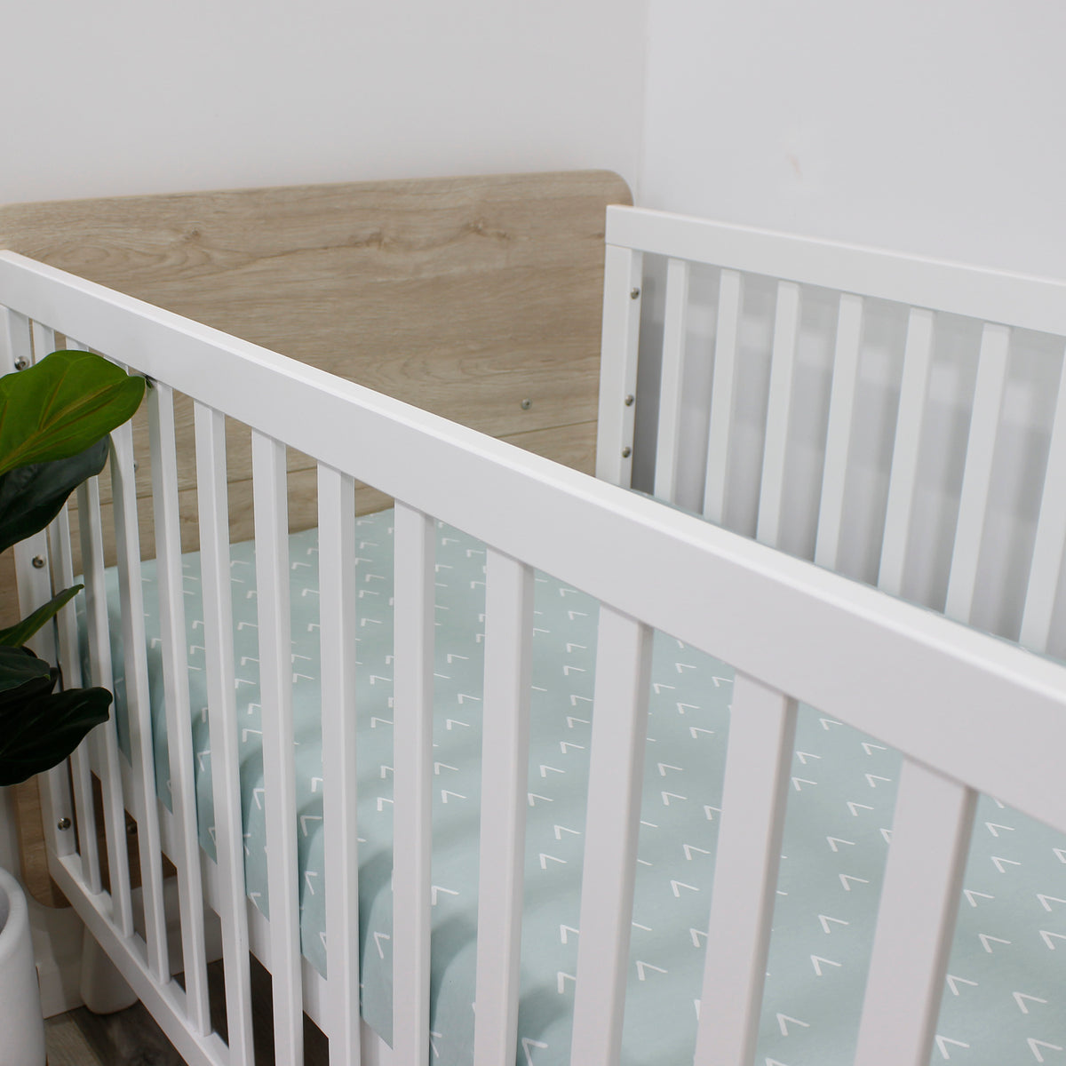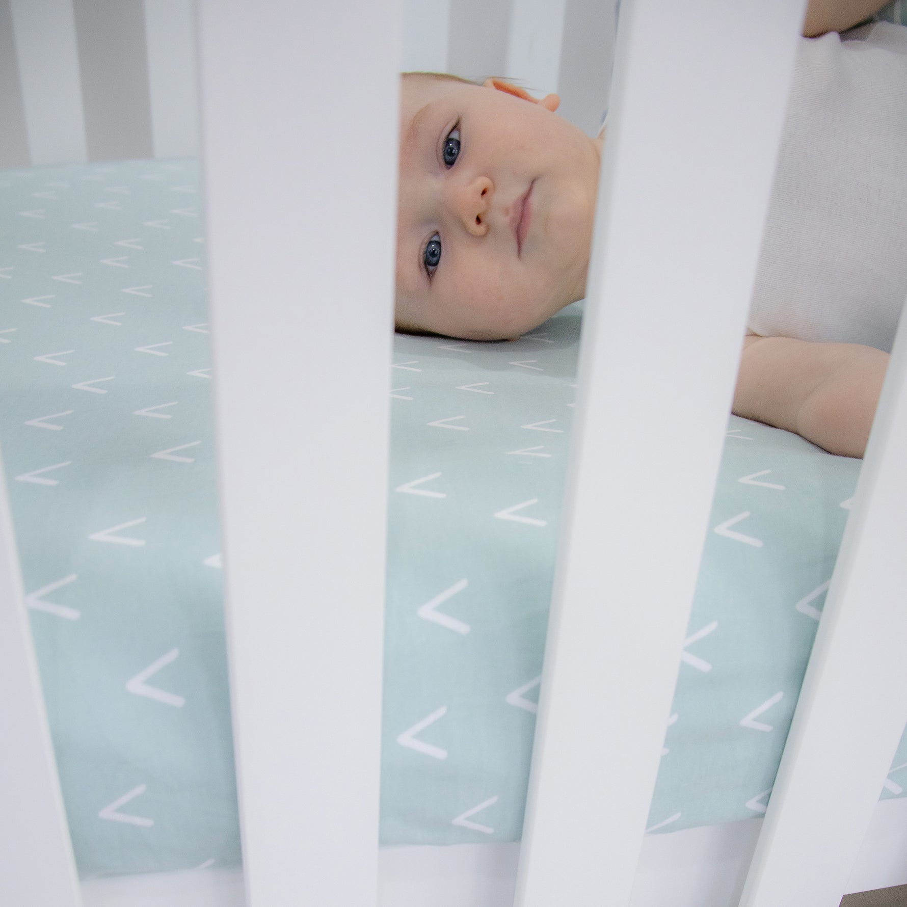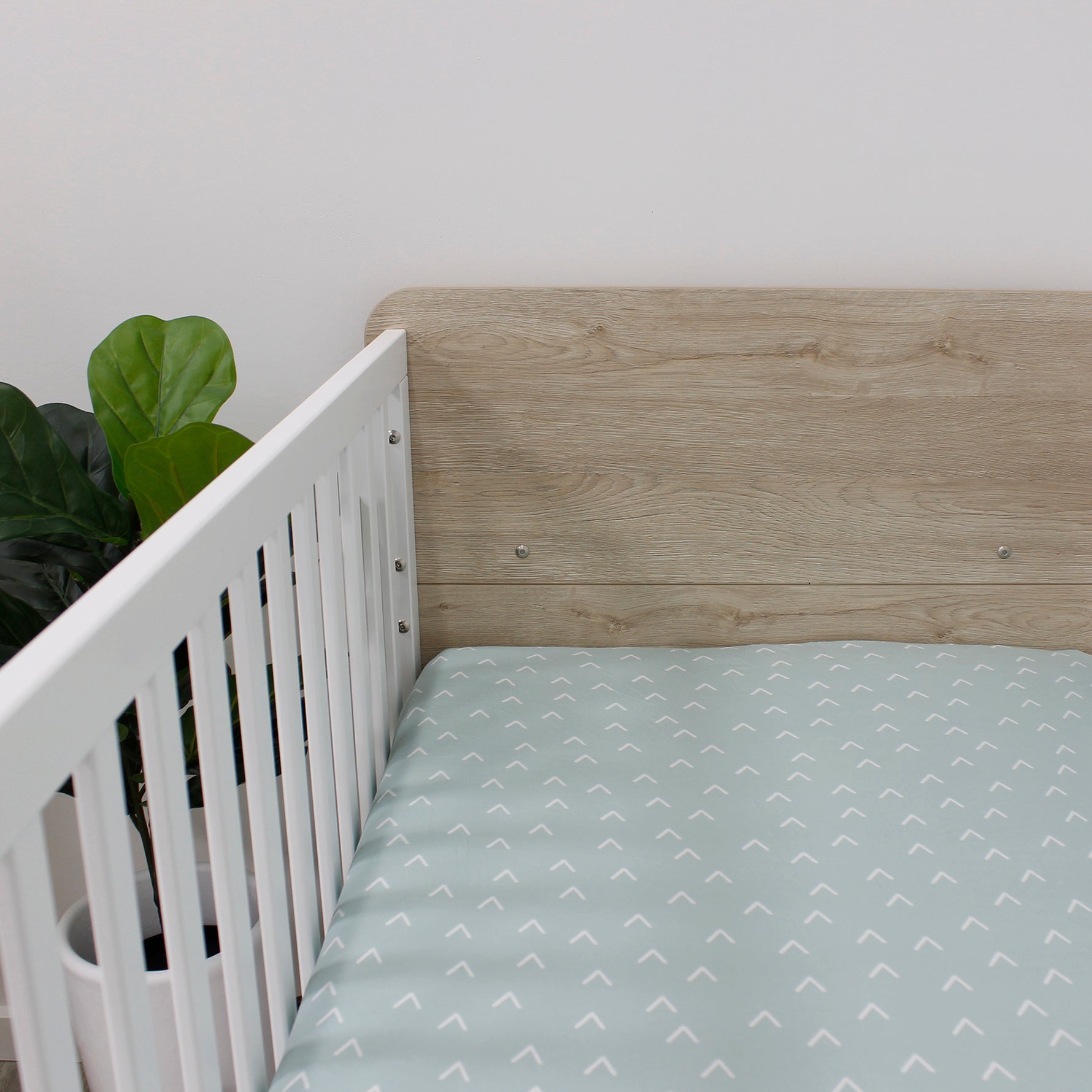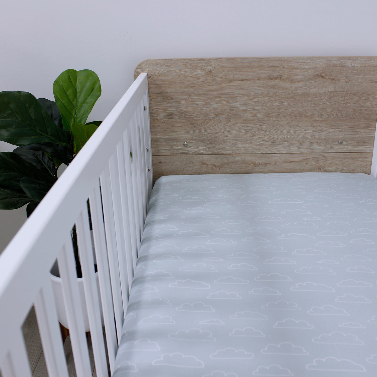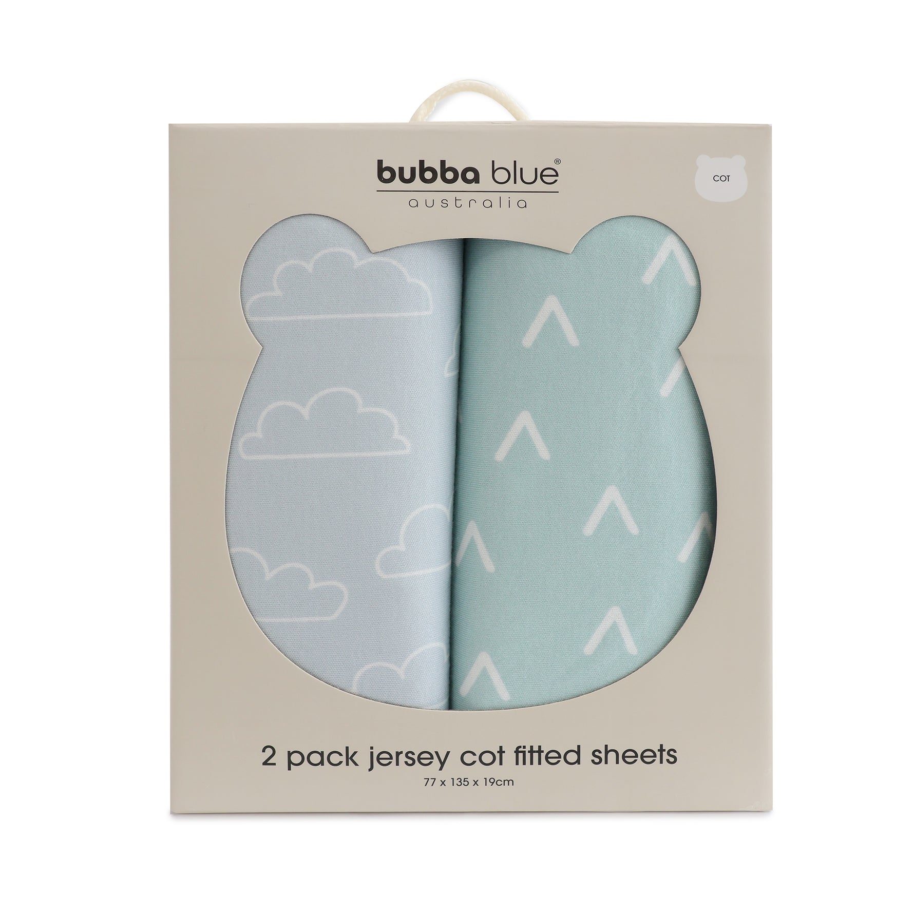 Pack includes one dusty blue cloud design and one mint nordic mountain design cot fitted sheet.