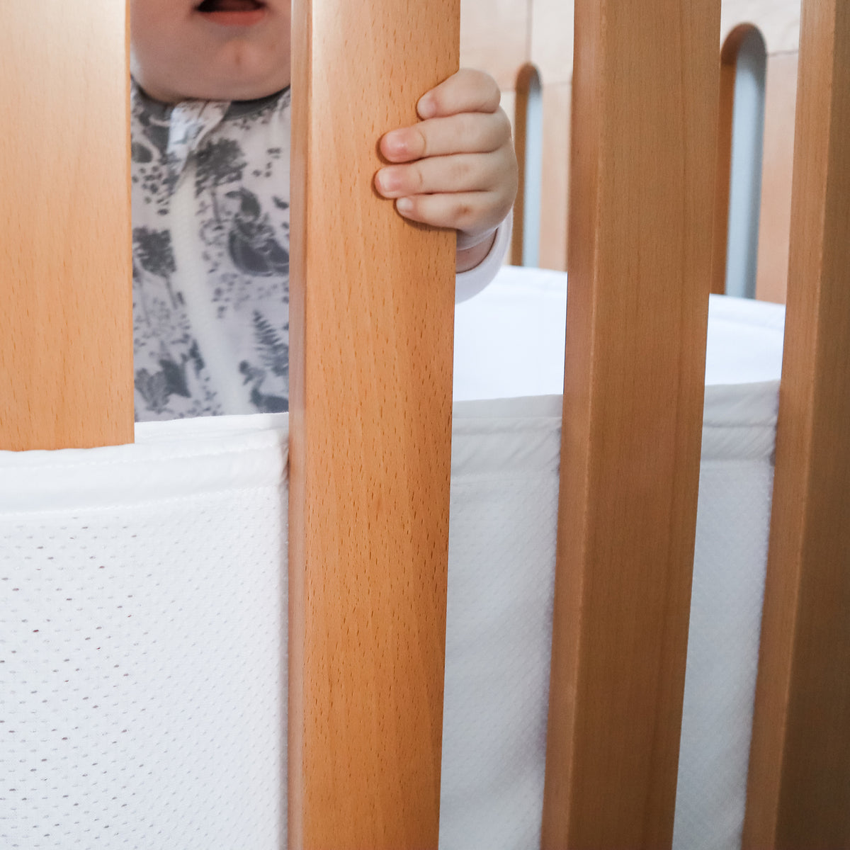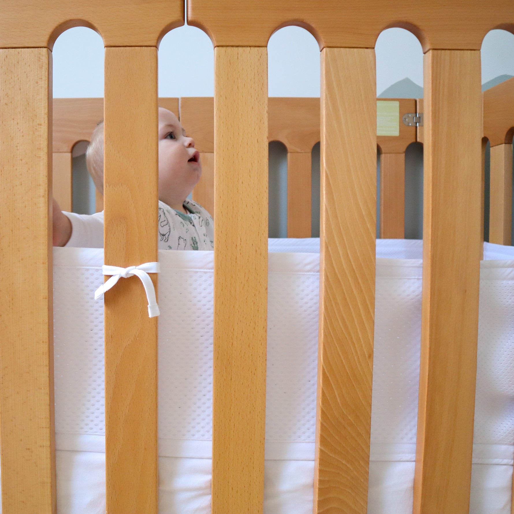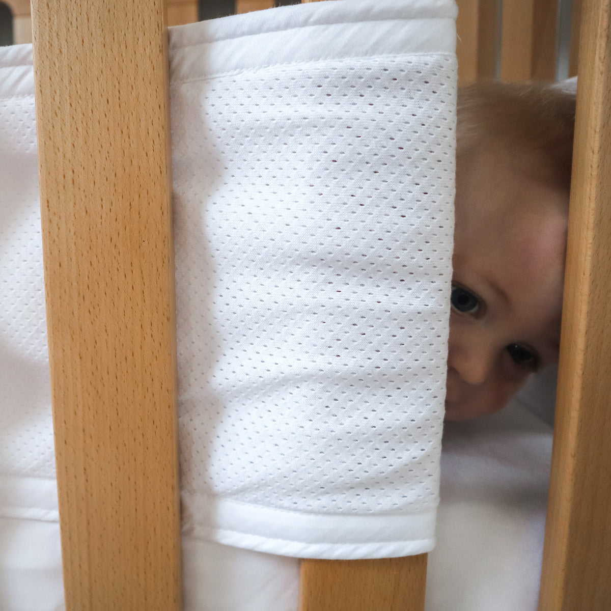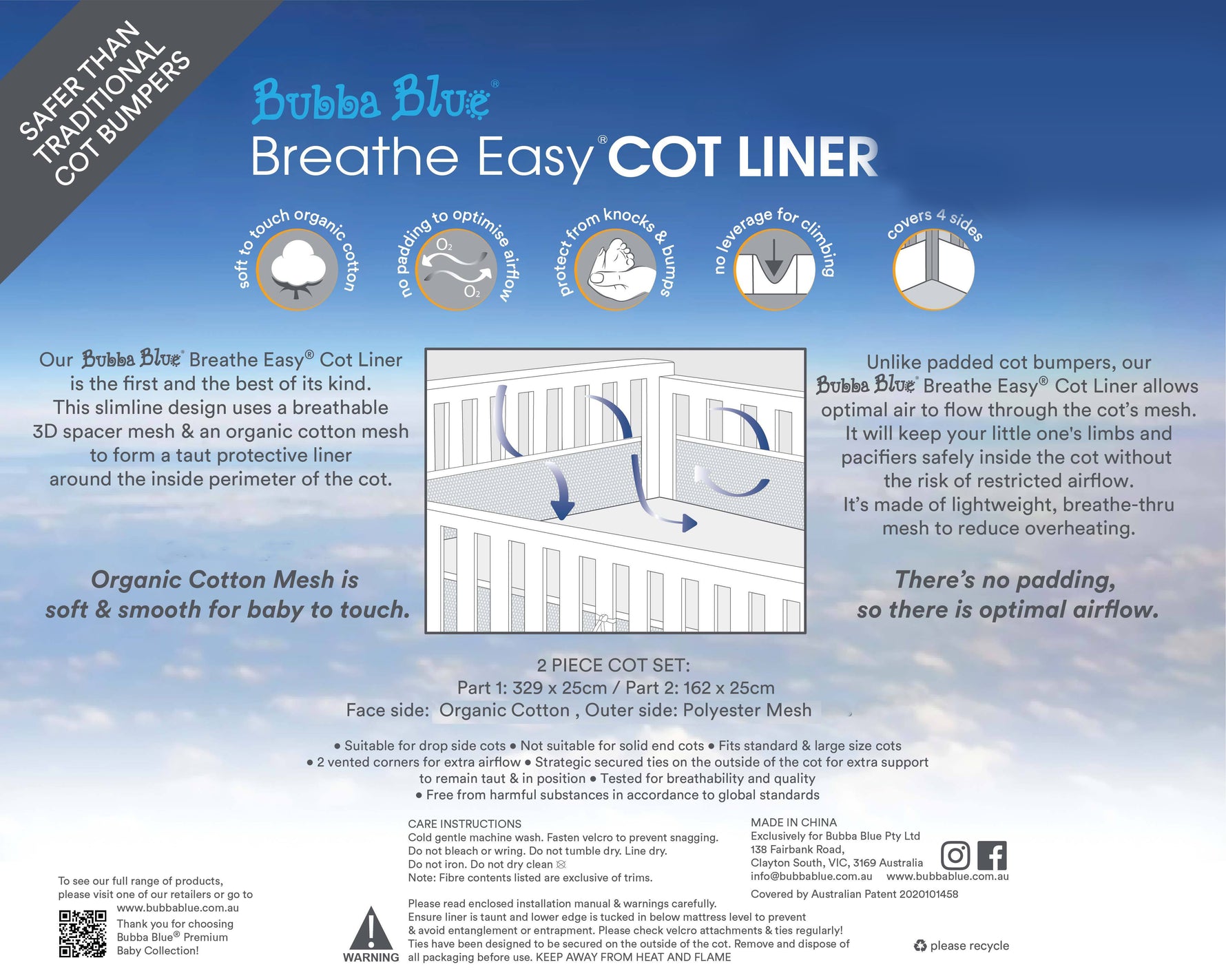 The Bubba Blue Breathe Easy® Cot Liner is the first and the best of its kind. This slimline design uses a 3D spacer mesh & an organic cotton mesh to form a taut protective liner around the inside perimeter of the cot.