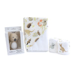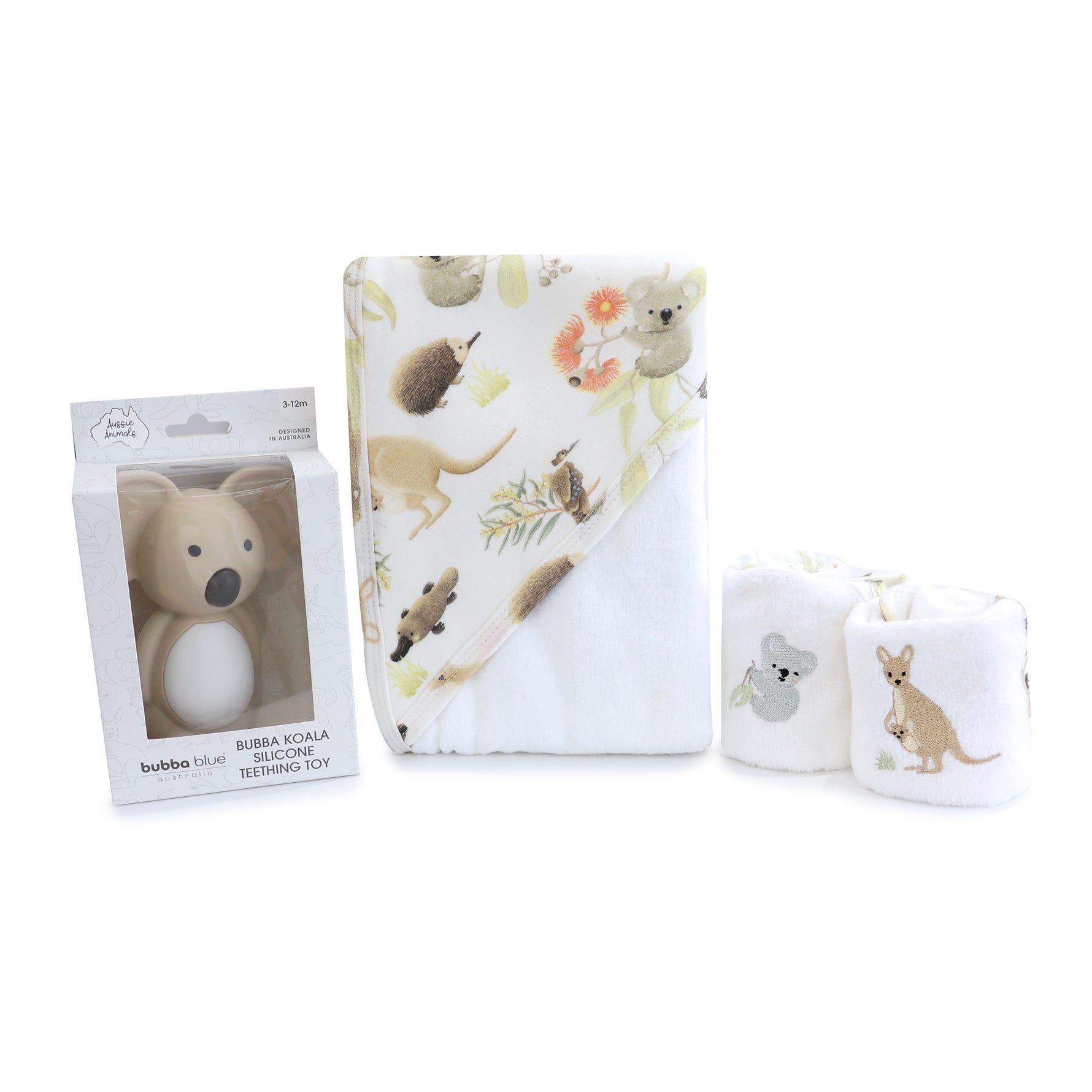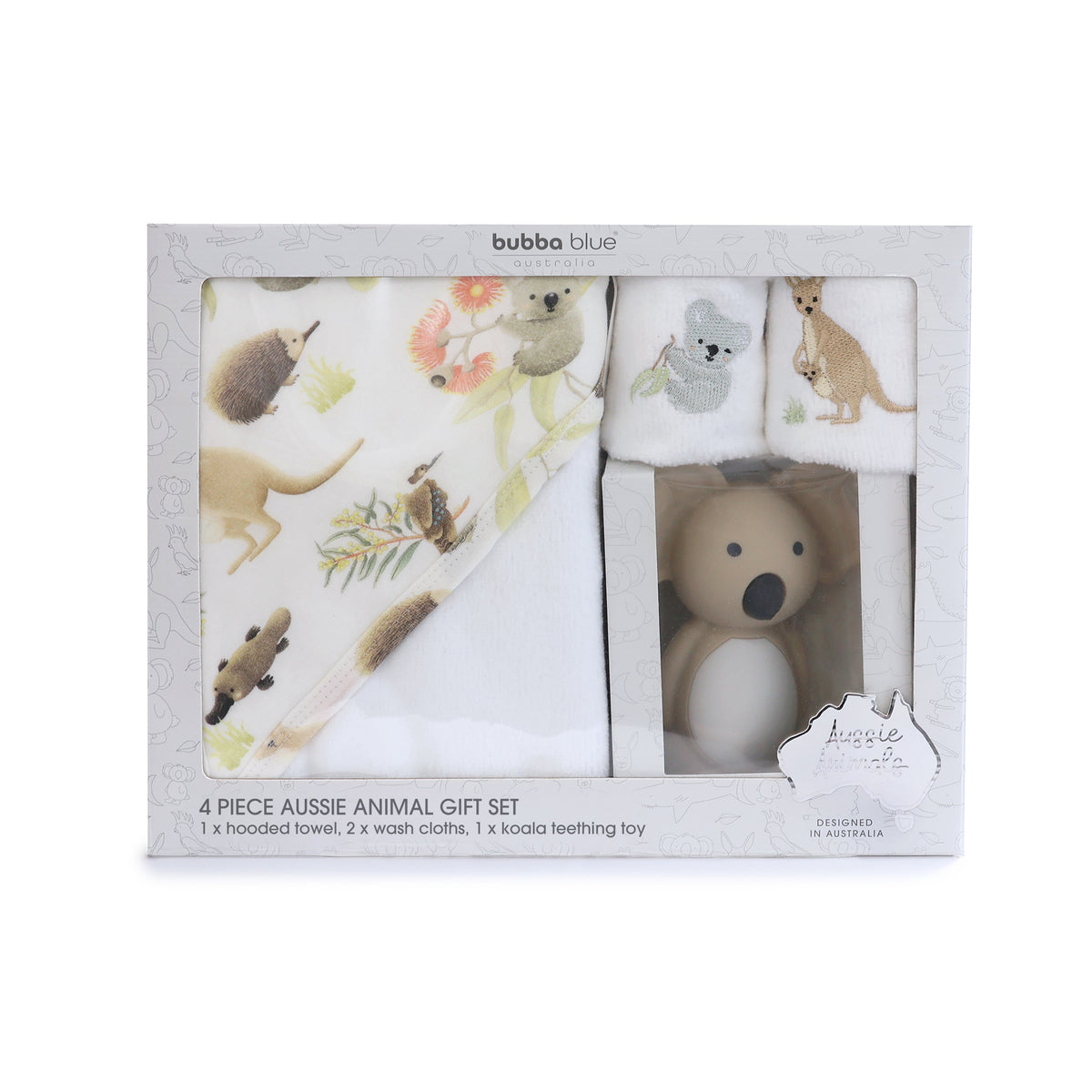 4 PIECE AUSSIE ANIMAL GIFT SET: 1 x hooded towel, 2 x wash cloths, 1 x koala teething toy.