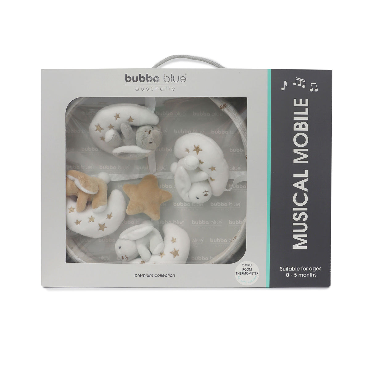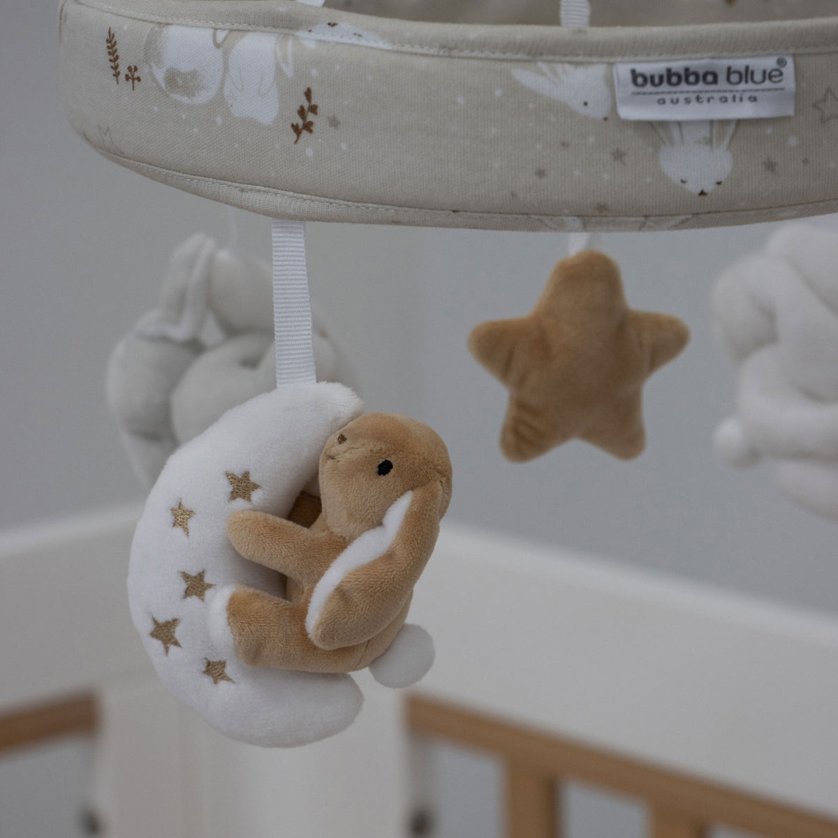With a wind up mechanism, this Musical Mobile from the Bubba Blue 'Bunny Dreams' Collection features cute white & beige bunnies in the night sky hugging the moon. It's sure to entertain and slowly drift baby into a dreamy and relaxing sleep.