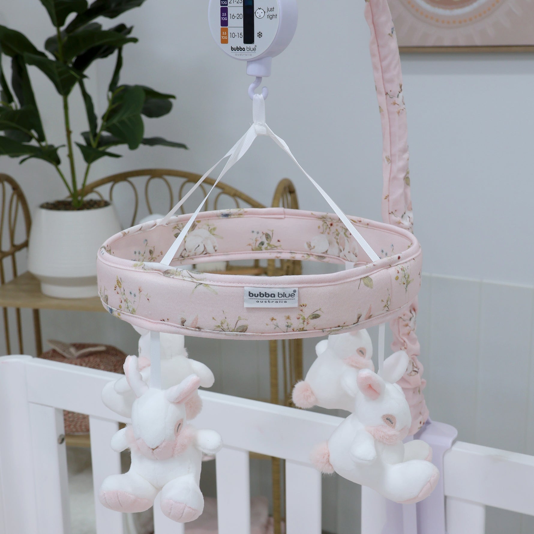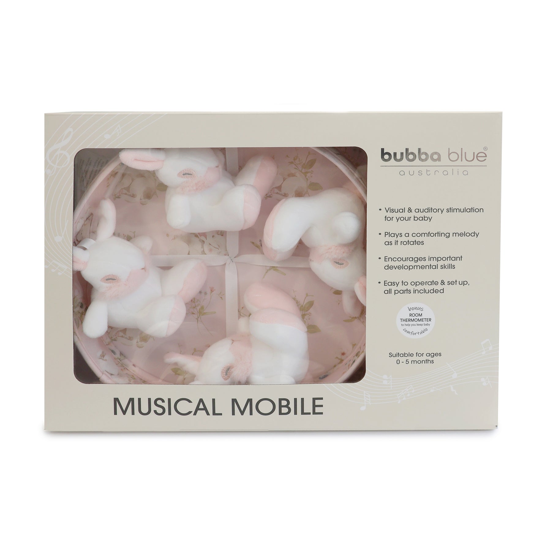 • Plays a comforting melody as it rotates, Nursery room thermometer included