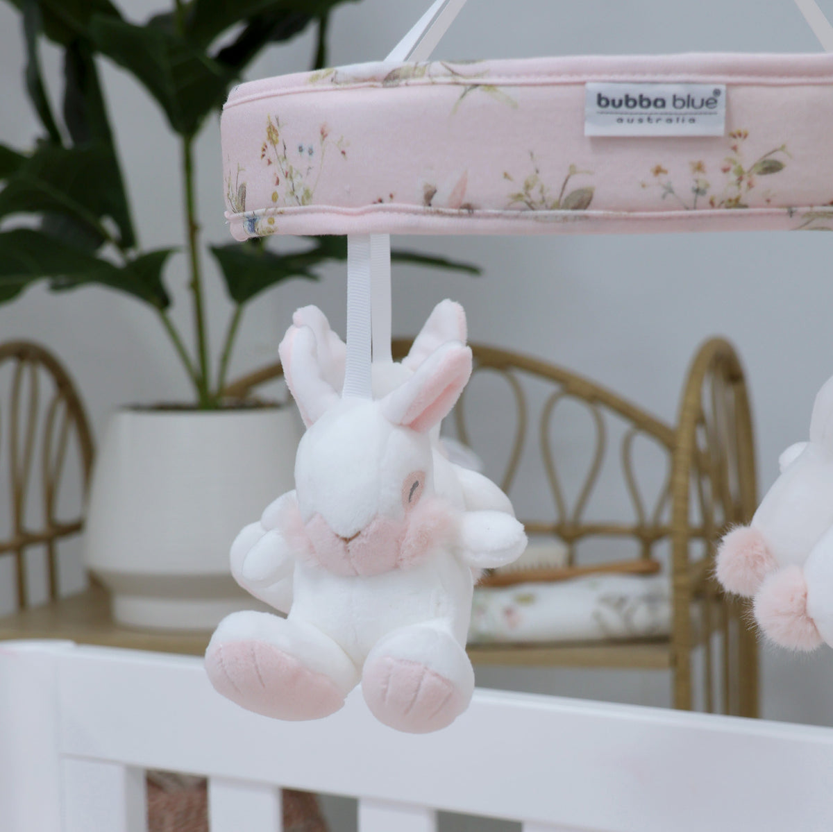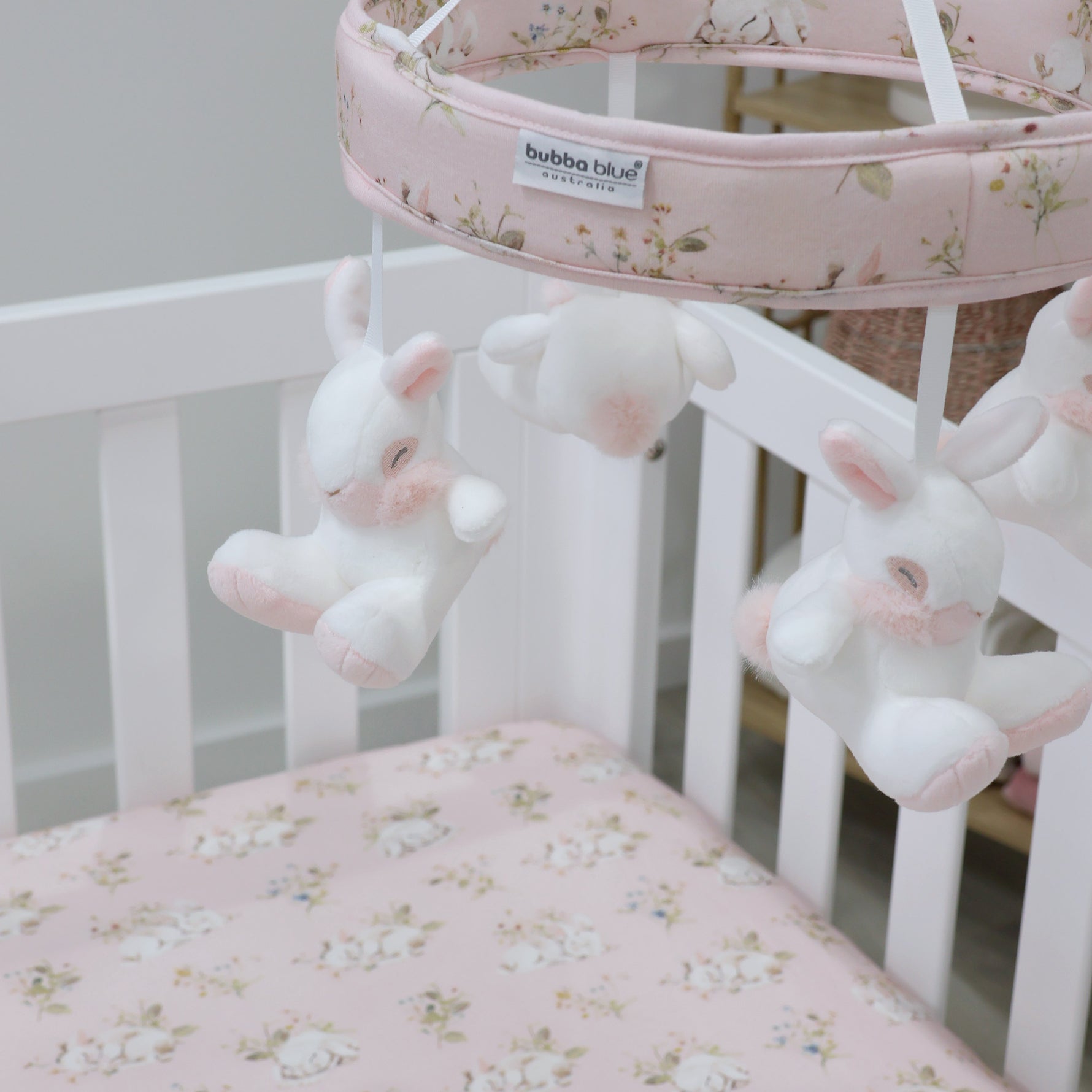 Gorgeous musical mobile featuring adorable sleepy bunnies is sure to delight little ones.