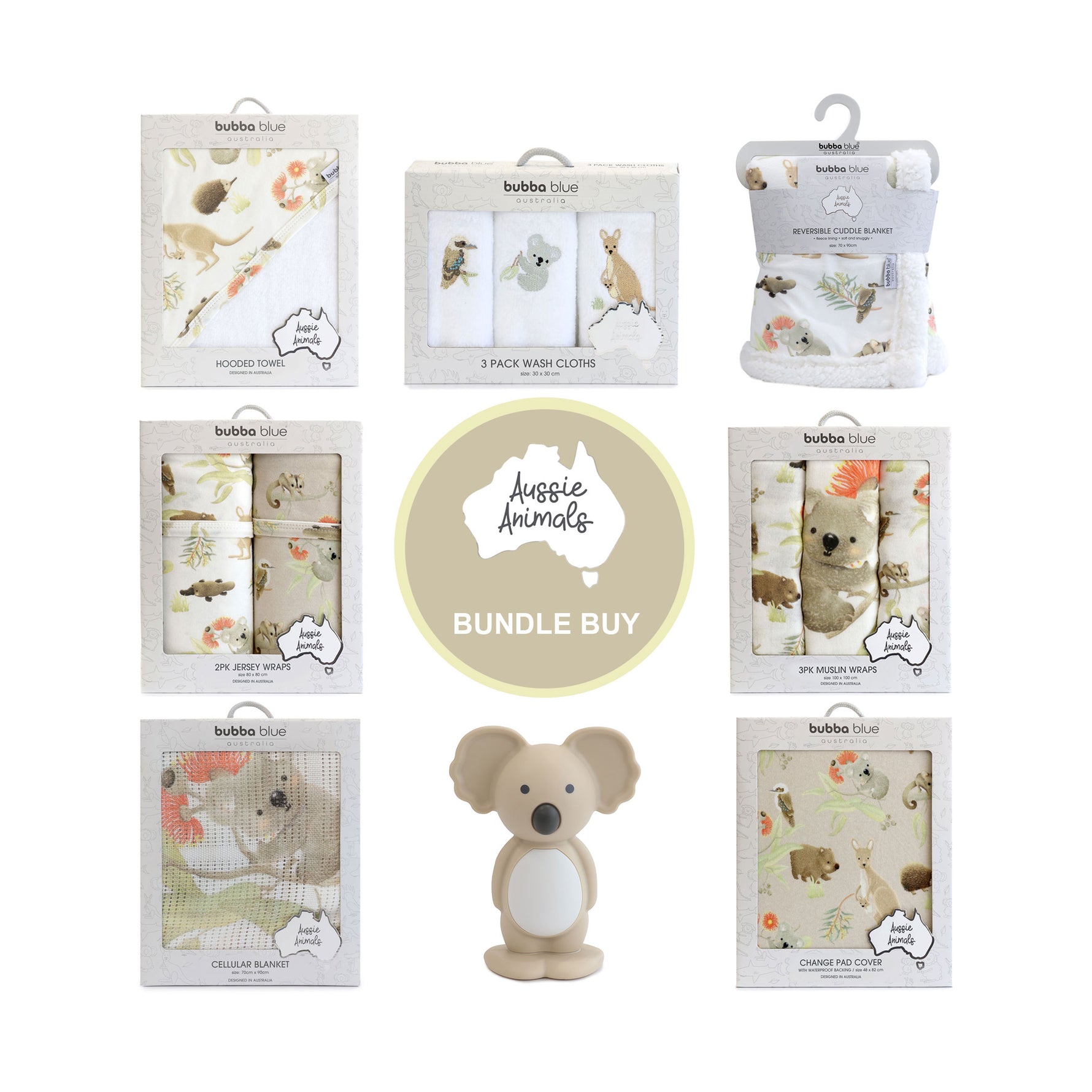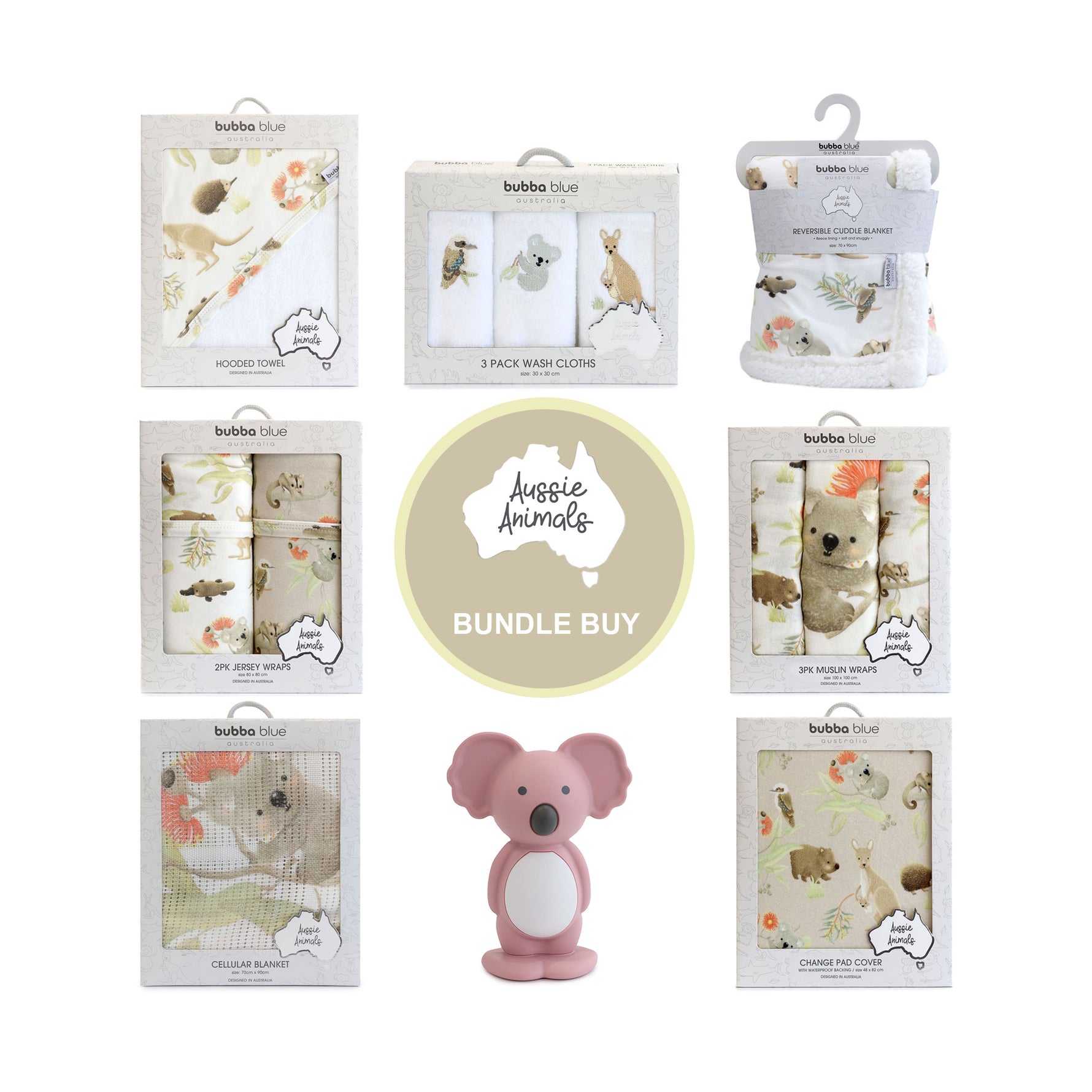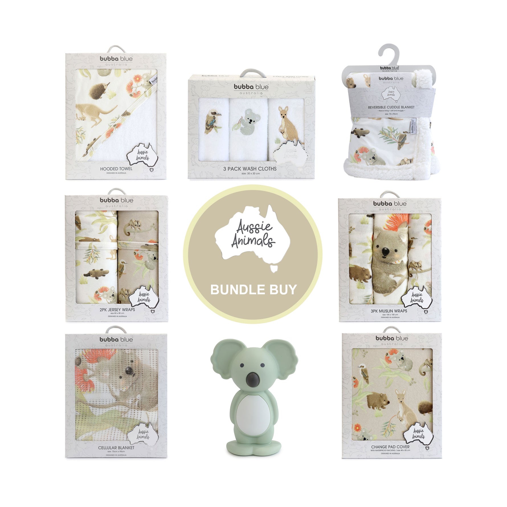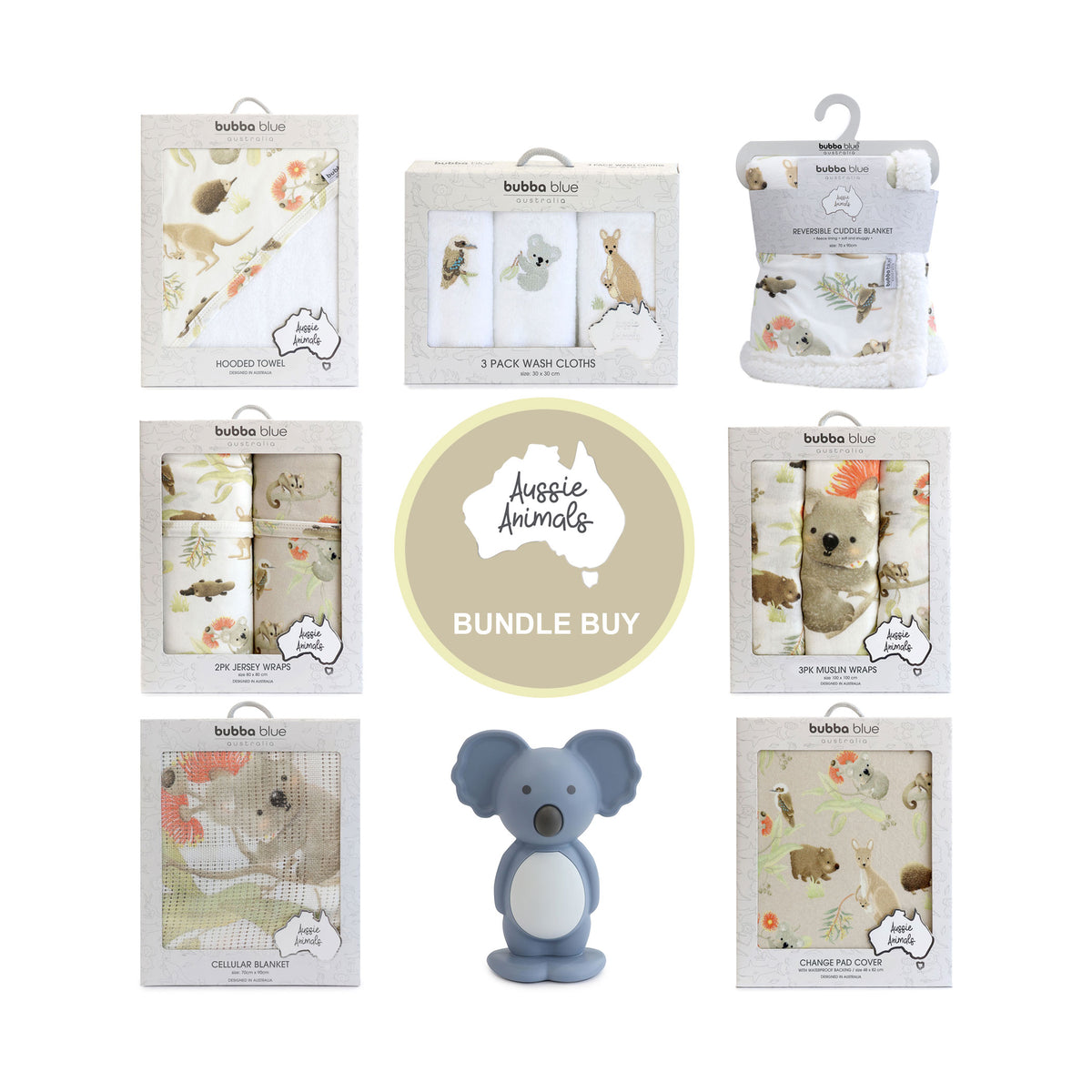 This bundle includes 1x Aussie Animals Hooded Towel, 1x Aussie Animals 3pk Wash Cloths, 1x Aussie Animals Cuddle Blanket, 1x Aussie Animals 2pk Jersey Wraps, 1x Aussie Animals 3pk Muslin Wraps, 1x Aussie Animals Cellular Blanket, 1x Aussie Animals Waterproof Change Mat Cover, and 1x Aussie Animals Bubba Koala Silicone Teething Toy (colour options: Grey, Steel Blue, Sand or Eucalyptus)