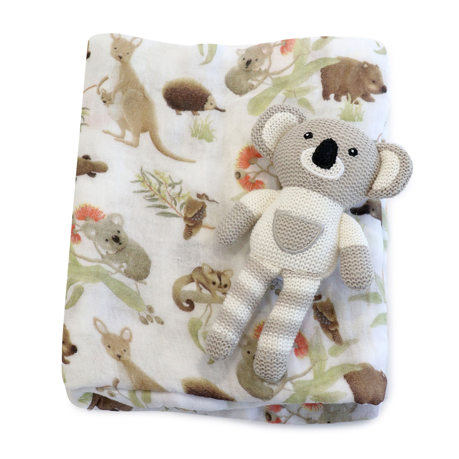 Aussie Animals Koala Muslin Swaddle Wrap and Knit Rattle Toy Gift Set
