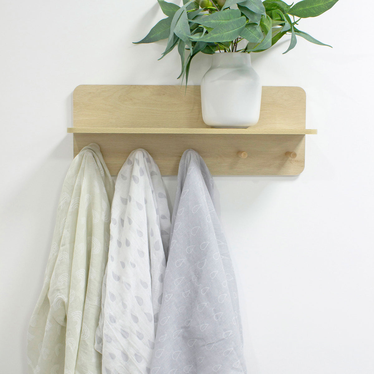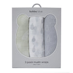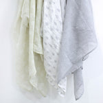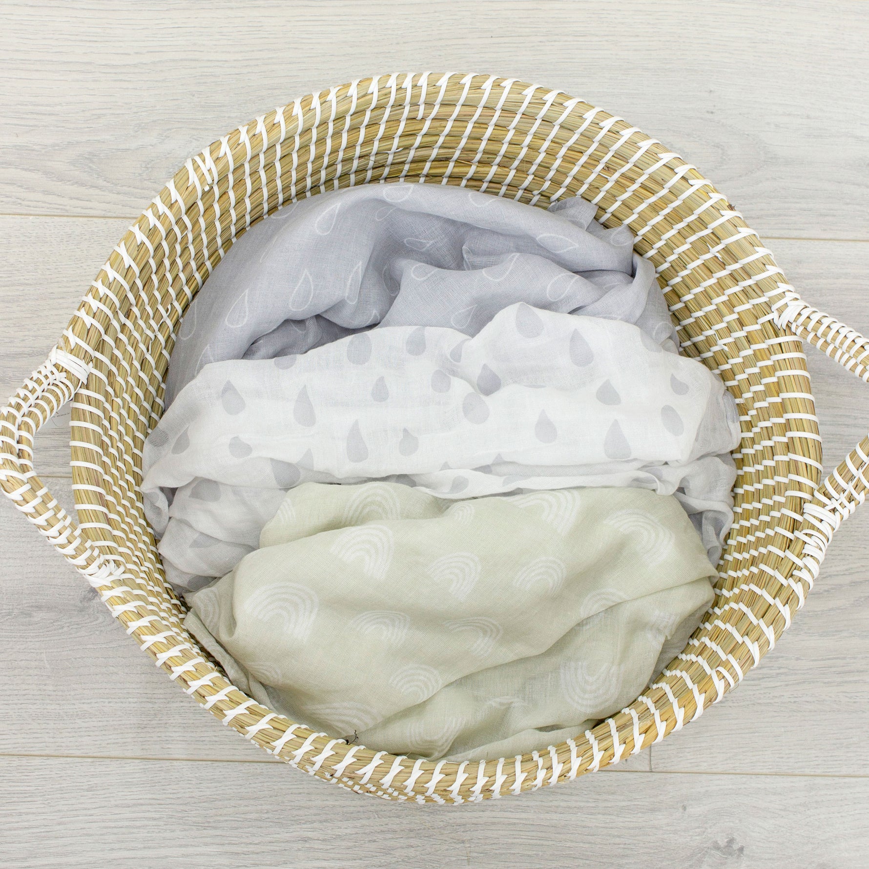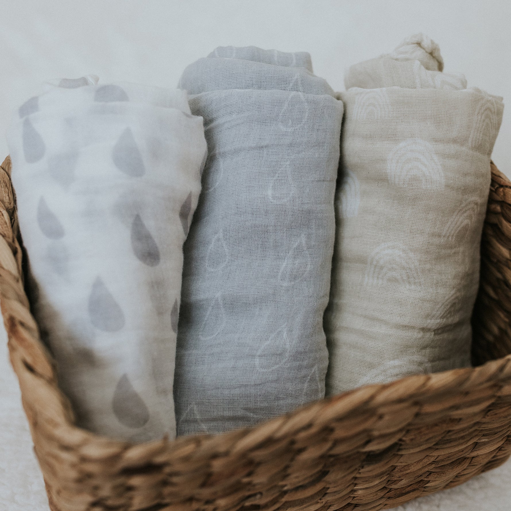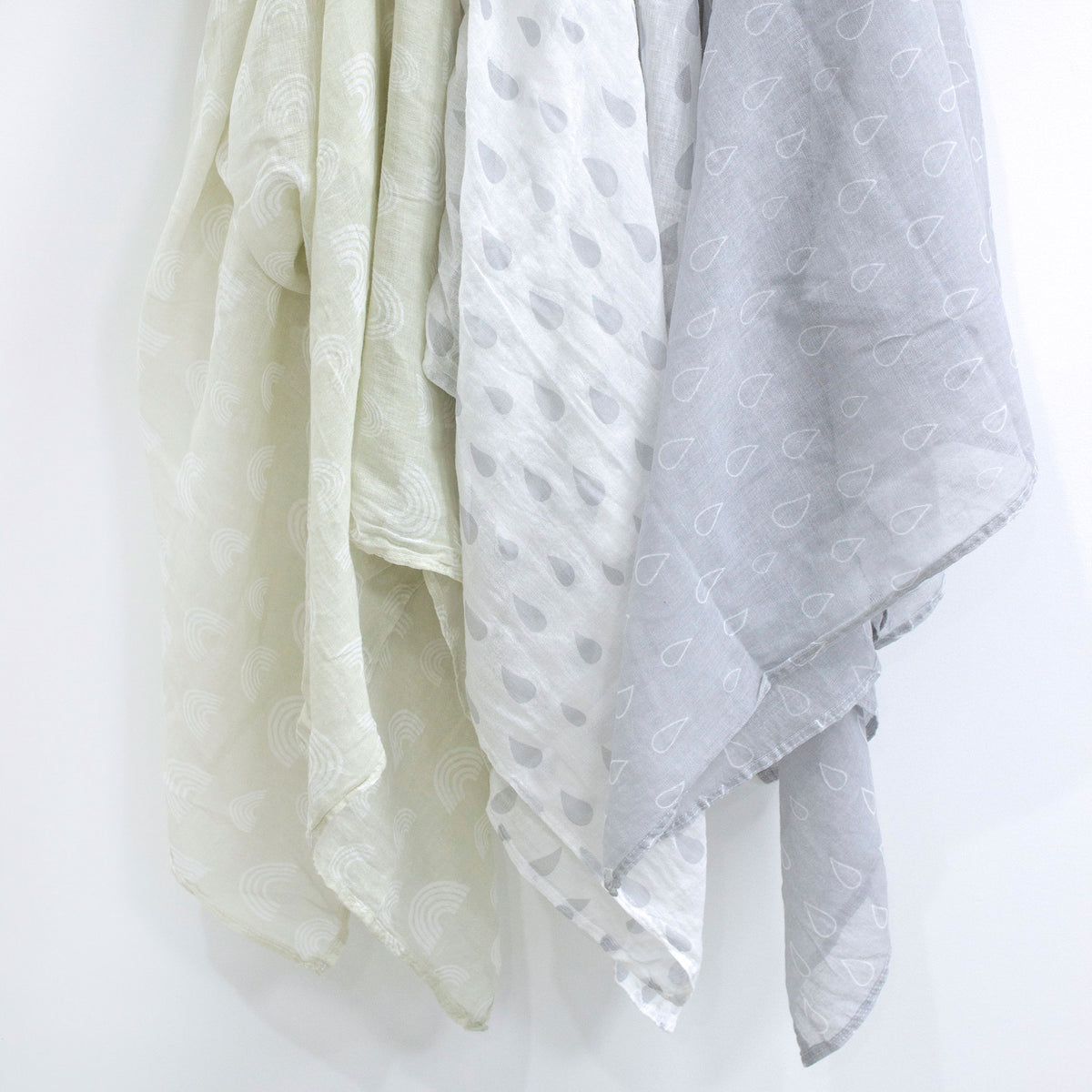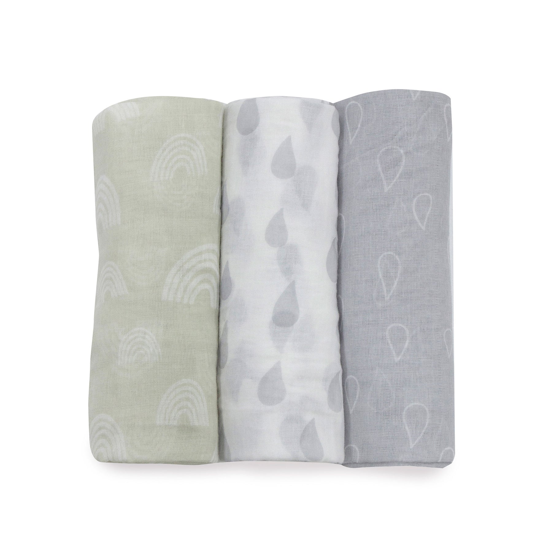 Pack includes two grey/white raindrop designs and one sand rainbow design muslin wrap.