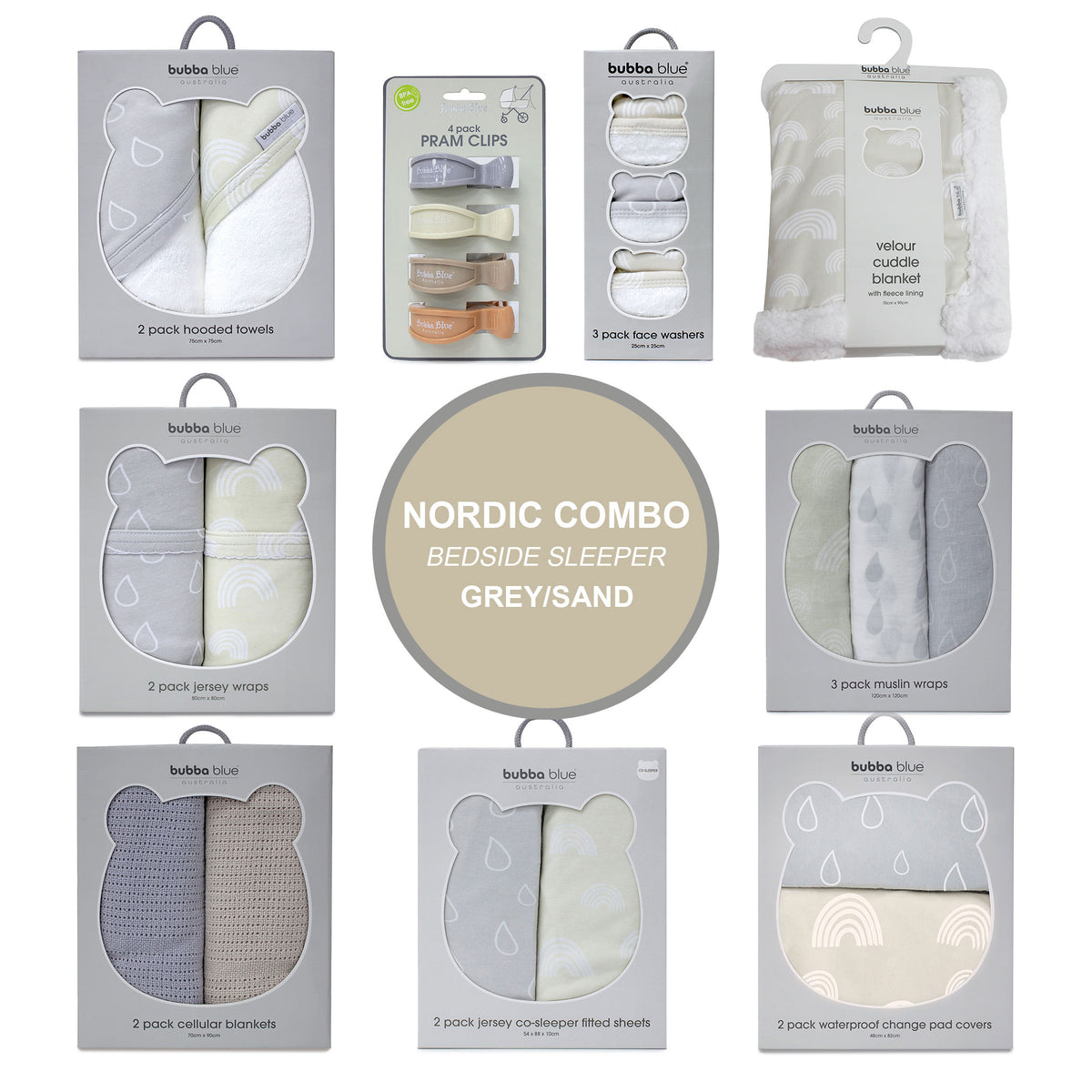 This Combo Contains 1x Nordic 2pk Hooded Towel, 1x Nordic 3pk Wash Cloth,  1x Nordic 2pk Jersey Co-sleeper Fitted Sheets, 1x Nordic 3pk Muslin Wraps, 1x Nordic 2pk Cellular Blanket, 1x Nordic 2pk Waterproof Change Pad Covers, 1x Nordic 2pk Jersey Wrap, 1x Nordic Velour Cuddle Blanket with Fleece Lining, and 1x 4pk Pram Clips.