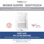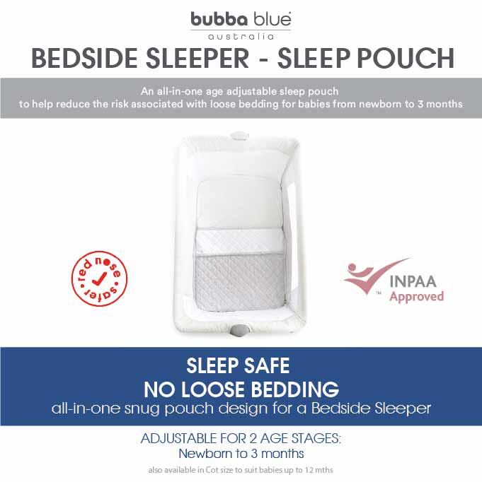 Sleep baby safely with the patented Bubba Blue® Sleep Pouch. An all-in-one sleep pouch design to help reduce the risk associated with loose bedding for babies in a bedside sleeper.