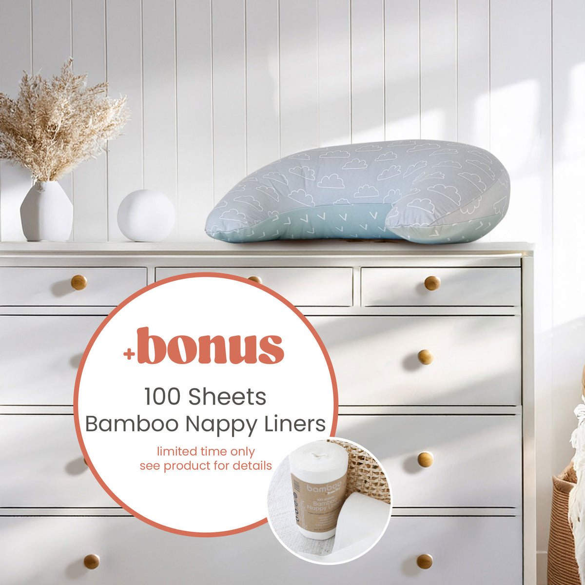 Buy 1x Nordic Nursing Pillow Get 1x FREE Bamboo 100 Sheets Nappy Liners (bonus Bamboo 100 Sheets Nappy Liners will be packed automatically)