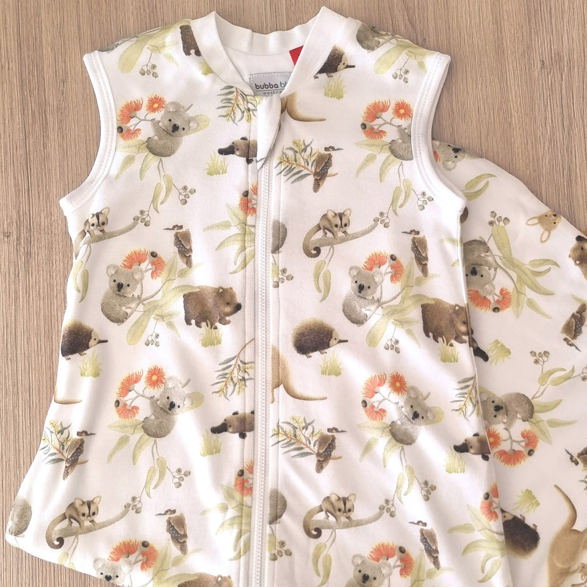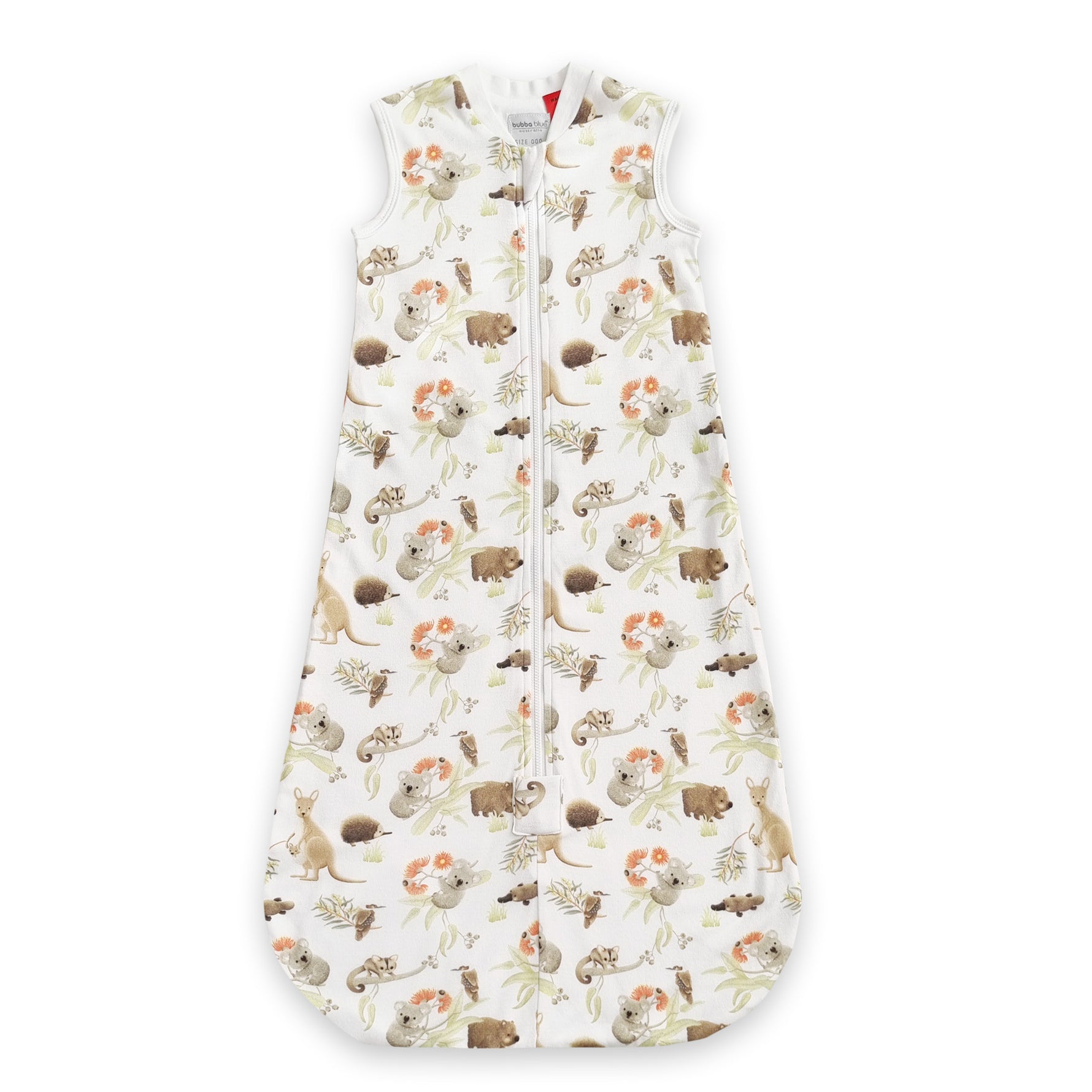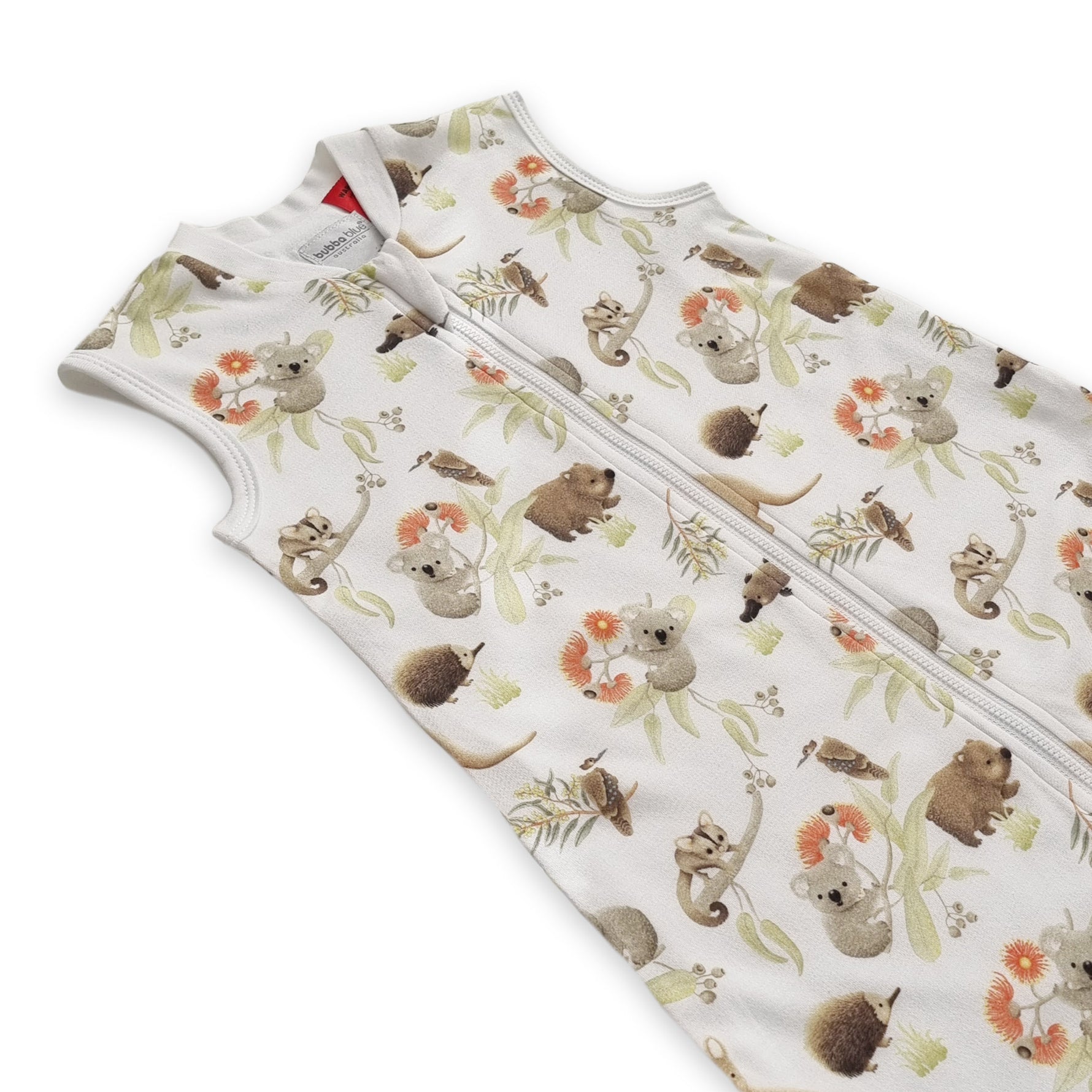 Baby will love the silky softness and comfort of our Bamboo/Cotton sleepbags. The lightweight & stretchy bamboo/cotton jersey is ideal for mild weather. Featuring a sweet all-over print with our favourite Australian bush animals.
