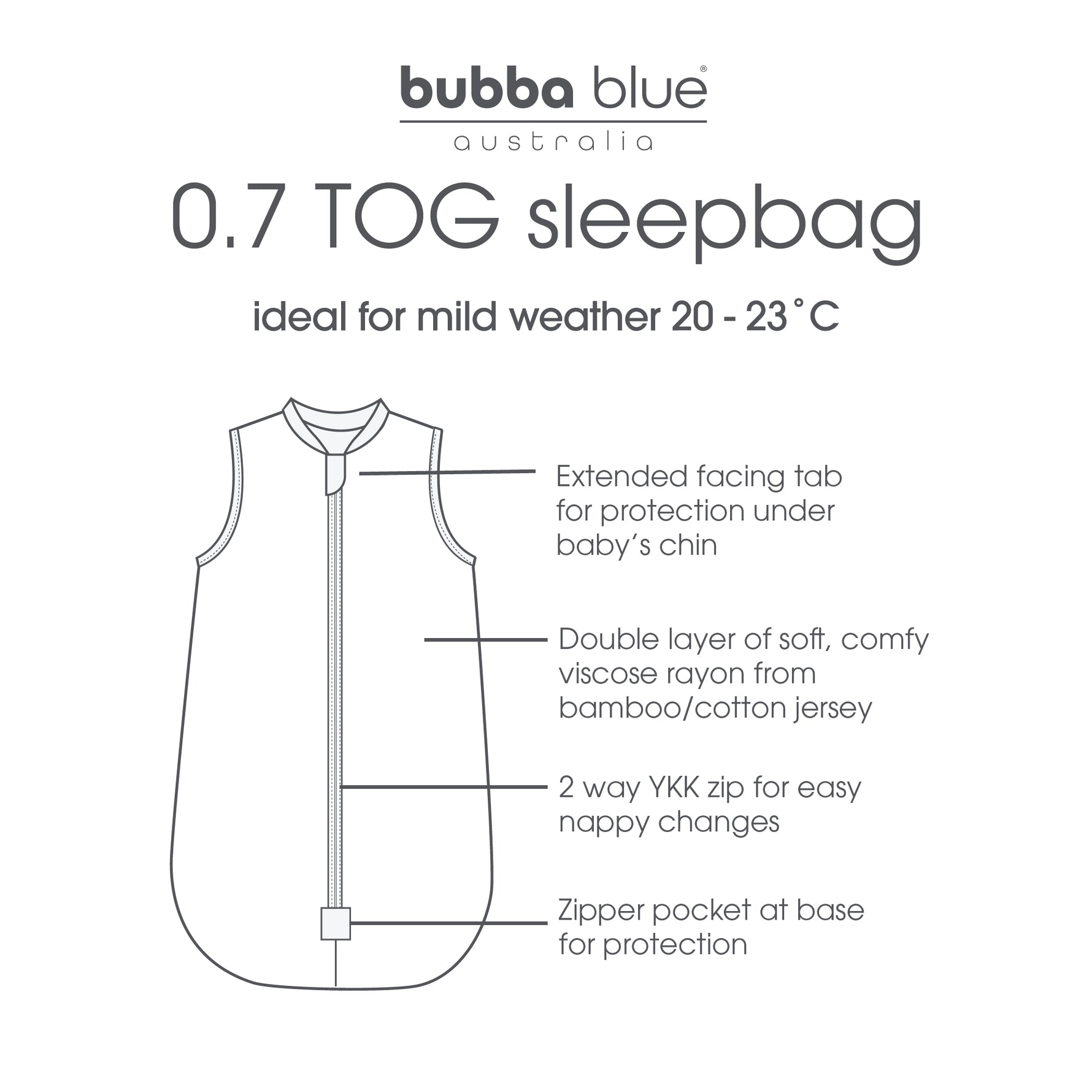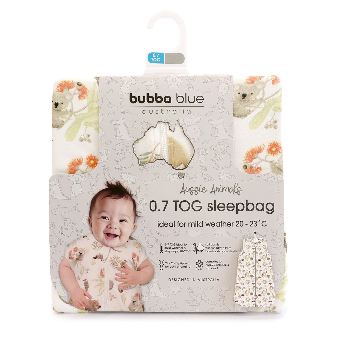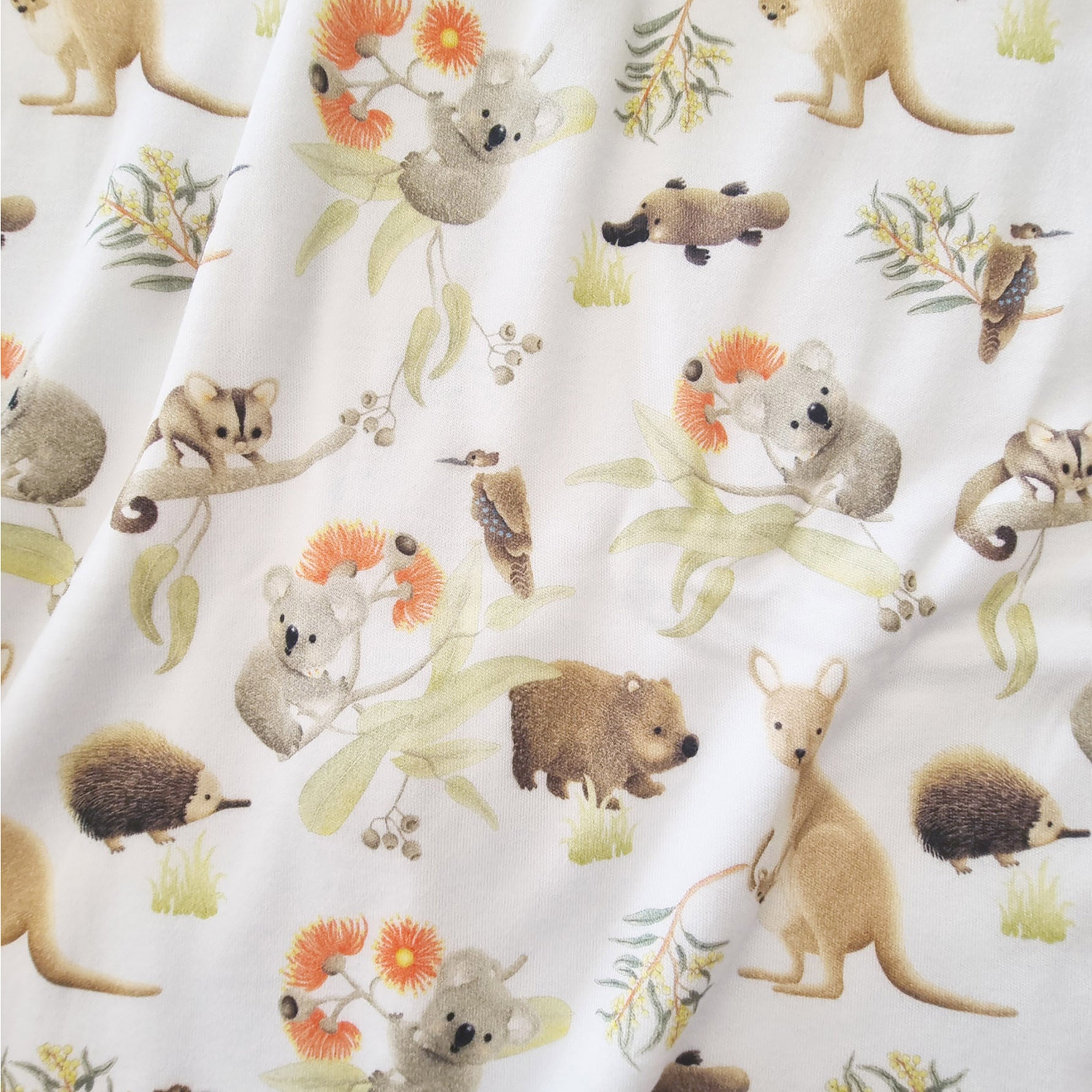Baby will love the silky softness and comfort of our Bamboo/Cotton sleepbags. The lightweight & stretchy bamboo/cotton jersey is ideal for mild weather. Featuring a sweet all-over print with our favourite Australian bush animals.