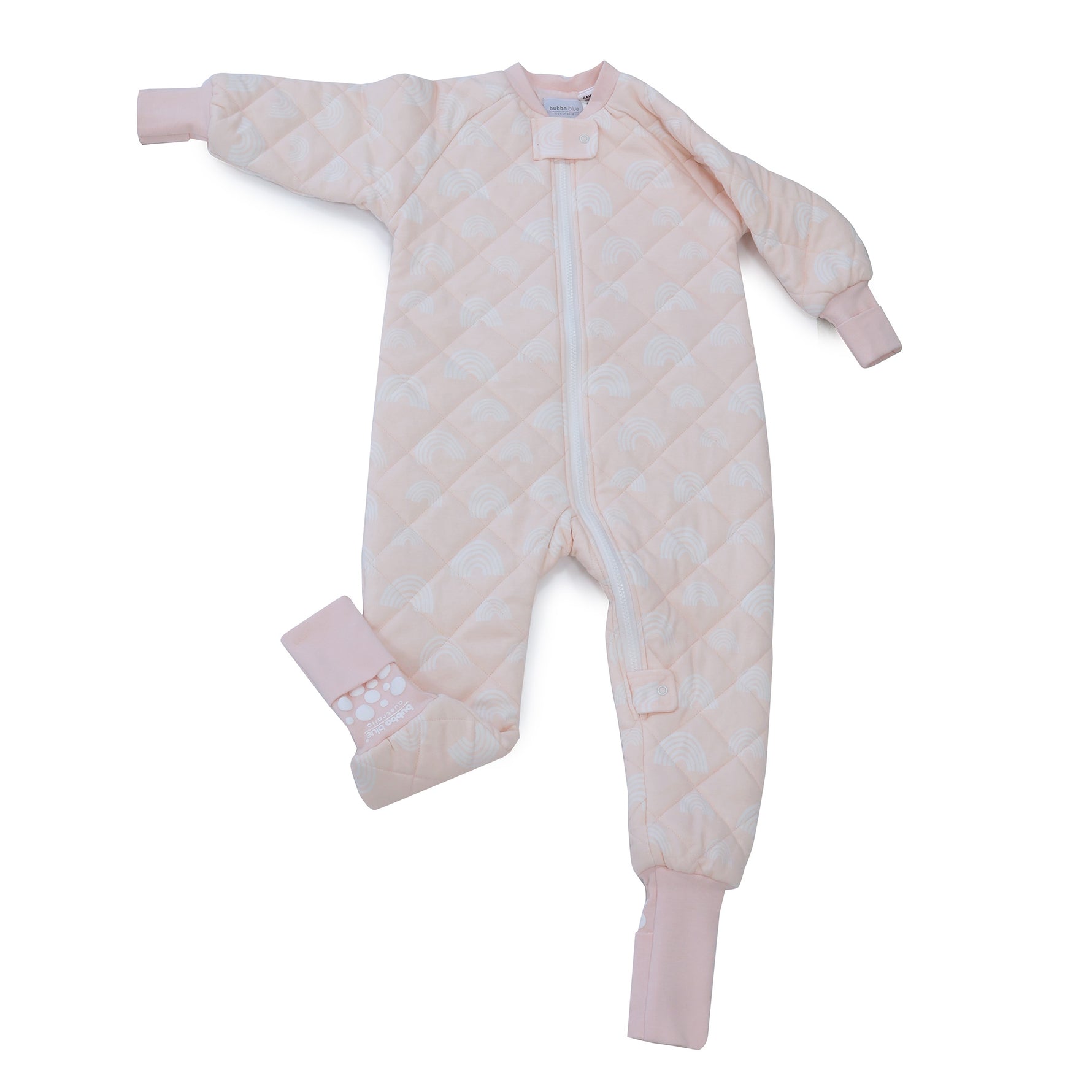 • Envelope feet cuffs, so little feet can be in or out. The soles have rubber grip pads to help reduce the risk of slipping.