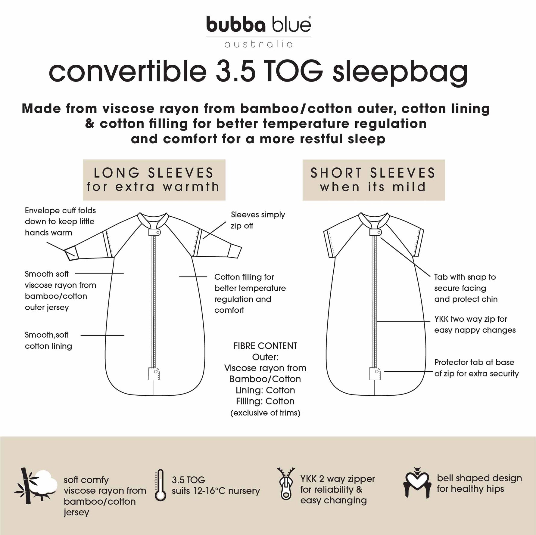 • 3.5 TOG sleepbag suits nursery temperatures 12-16˚C