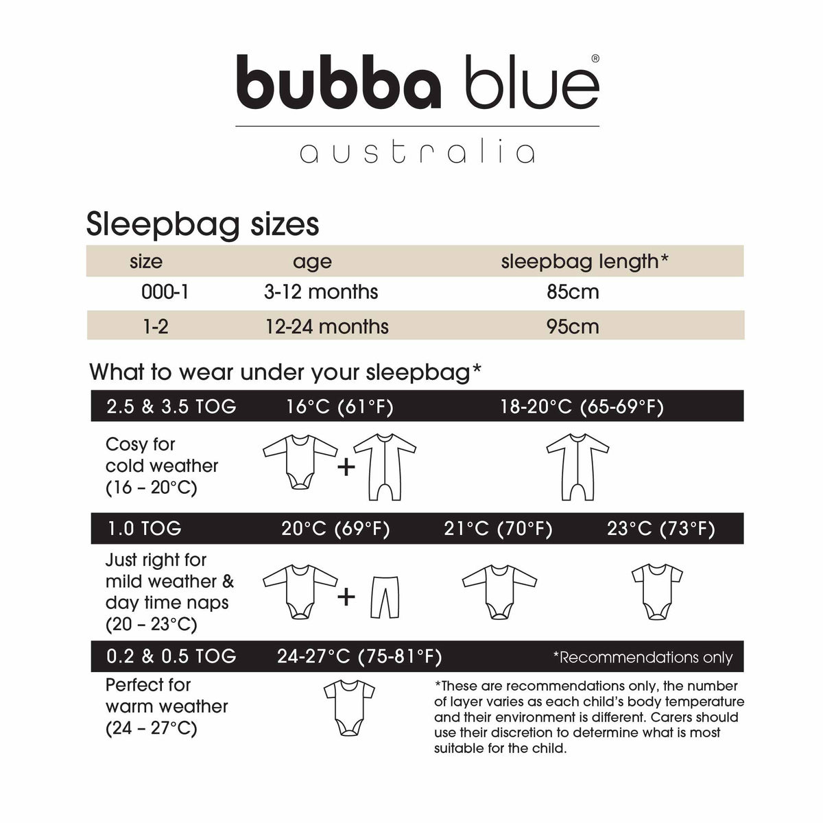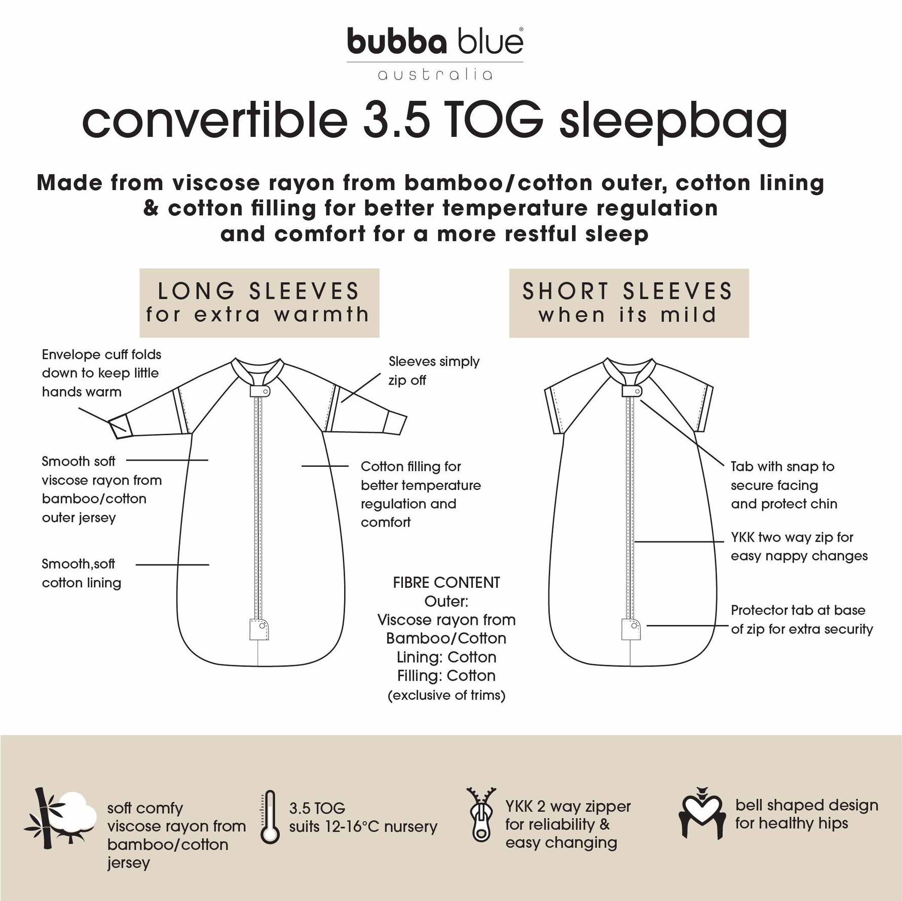 The Bubba Blue Convertible Sleep Bags is a genius solution to use from autumn to spring. The unique patented convertible sleep bag design allows the long sleeves to be zipped off to create a short sleeve sleep bag when temperatures are mild. The sleeves can be zipped on for extra warmth during those cooler days and nights. An ideal trans-seasonal sleepbag..